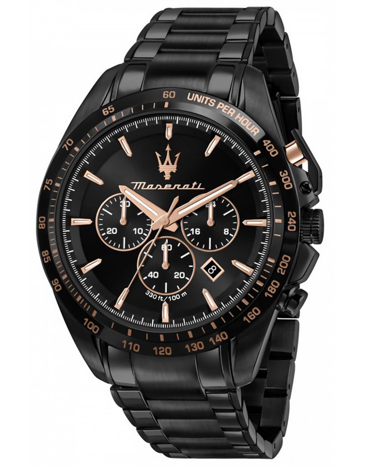 Мужские наручные часы-хронографХронографФункция позволяет измерять отрезки времени с особой точностью: часы, минуты, секунды. Верным признаком хронографа является наличие на циферблате 3 дополнительных окошек-счётчиков. Maserati R8873612048, кварцевый механизм (автоматический калибр) с высокой точностью. Минеральное стеклоМинеральное стеклоМинеральное стекло представляет собой искусственно выращенный минерал кварца. Такое стекло отличается особой устойчивостью к повреждениям и царапинам. Уступает по некоторым качествам сапфировому стеклу. устойчивое к появлению царапин, обладающее высокой прозрачностью. Стрелки с люминесцентным покрытиемЛюминесцентное покрытиеПозволяет считывать показания времени в темноте. Производители наносят на стрелки, часовые индексы, безель или поверхность циферблата светонакопительный состав, дающий холодное свечение.. Класс водозащиты: 100 метров, позволит плавать, нырять и заниматься другими водными видами спорта. Корпус часов изготовлен из нержавеющей стали с PVD-покрытиемPVDУльтратонкое покрытие наносится в технике вакуумного напыления, сочетает в себе нитрид титана особой прочности со слоем золота или оксида хрома. Несёт в себе декоративную или защитную функцию.. Браслет с раскладной застёжкойРаскладная застёжкаТакой тип застёжки используется только на браслетах из металла. Она никогда не раскрывается полностью, происходит разделение на 2 и более частей. Раскладывающая застёжка снизит вероятность потери часов к минимуму. и с PVD-покрытиемPVDУльтратонкое покрытие наносится в технике вакуумного напыления, сочетает в себе нитрид титана особой прочности со слоем золота или оксида хрома. Несёт в себе декоративную или защитную функцию..