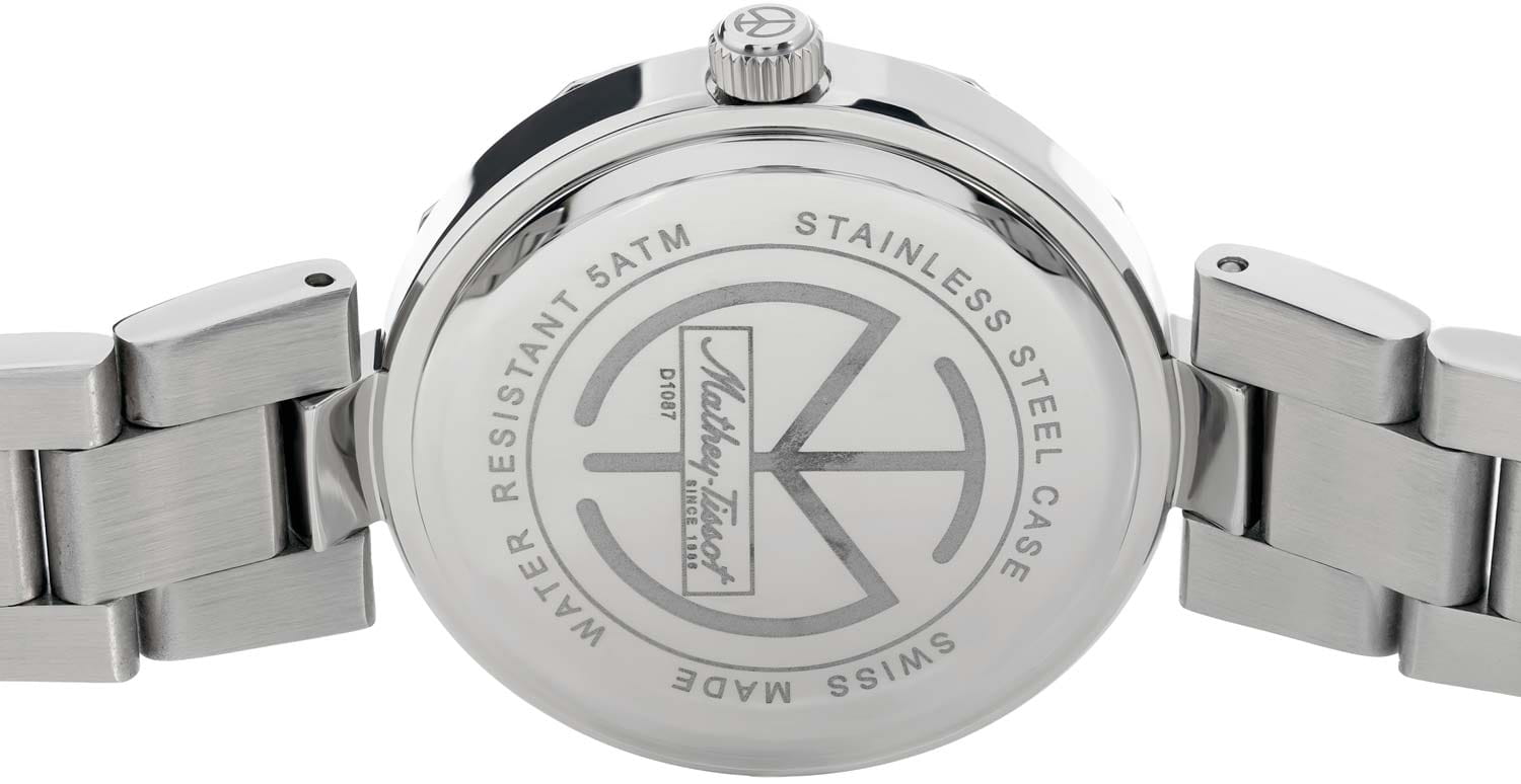 Женские кварцевые часы Mathey-Tissot Molly D1087AQI — это стильное сочетание элегантности и современного дизайна. Изящный корпус выполнен из нержавеющей стали серебристого цвета, диаметром 32 мм, что придаст образу элегантности и надежности. БезельБезельВнешний ободок, закрепляющий стекло. В спортивных часах так называется поворотное кольцо с делениями на циферблате, выполняет роль таймера – замеряет отрезки времени на шкале. Неподвижный безель – элемент декора. Однонаправленно вращающийся безель на дайверских часах позволяет фиксировать моменты погружения и выныривания на поверхность. и циферблат украшены кристаллами. Изысканный циферблат с метками в виде точек придает модели особый блеск. Циферблат защищен минеральным стекломМинеральное стеклоМинеральное стекло представляет собой искусственно выращенный минерал кварца. Такое стекло отличается особой устойчивостью к повреждениям и царапинам. Уступает по некоторым качествам сапфировому стеклу. с сапфировым покрытием, обеспечивает устойчивость к царапинам. Часы оснащены надежным кварцевым механизмом. Стальной браслет на застёжке-бабочке с кнопкамиЗастёжка "бабочка"Такой вид застёжки дополняется предохранителями, помогающими избежать случайного раскрытия браслета. Обладают изящным исполнением. , гарантирует комфортное и безопасное ношение. Класс водозащиты: 50 метров позволит защитить корпус от случайных брызг или капель дождя. Mathey-Tissot — отличный выбор для тех, кто ценит утонченность и качество.