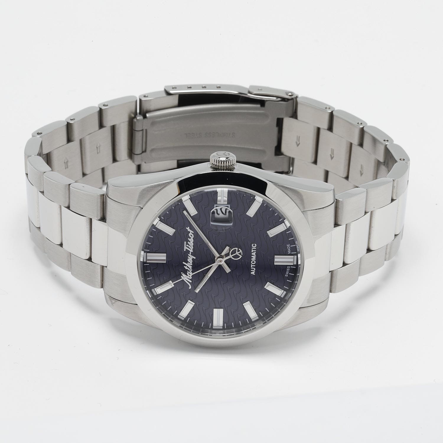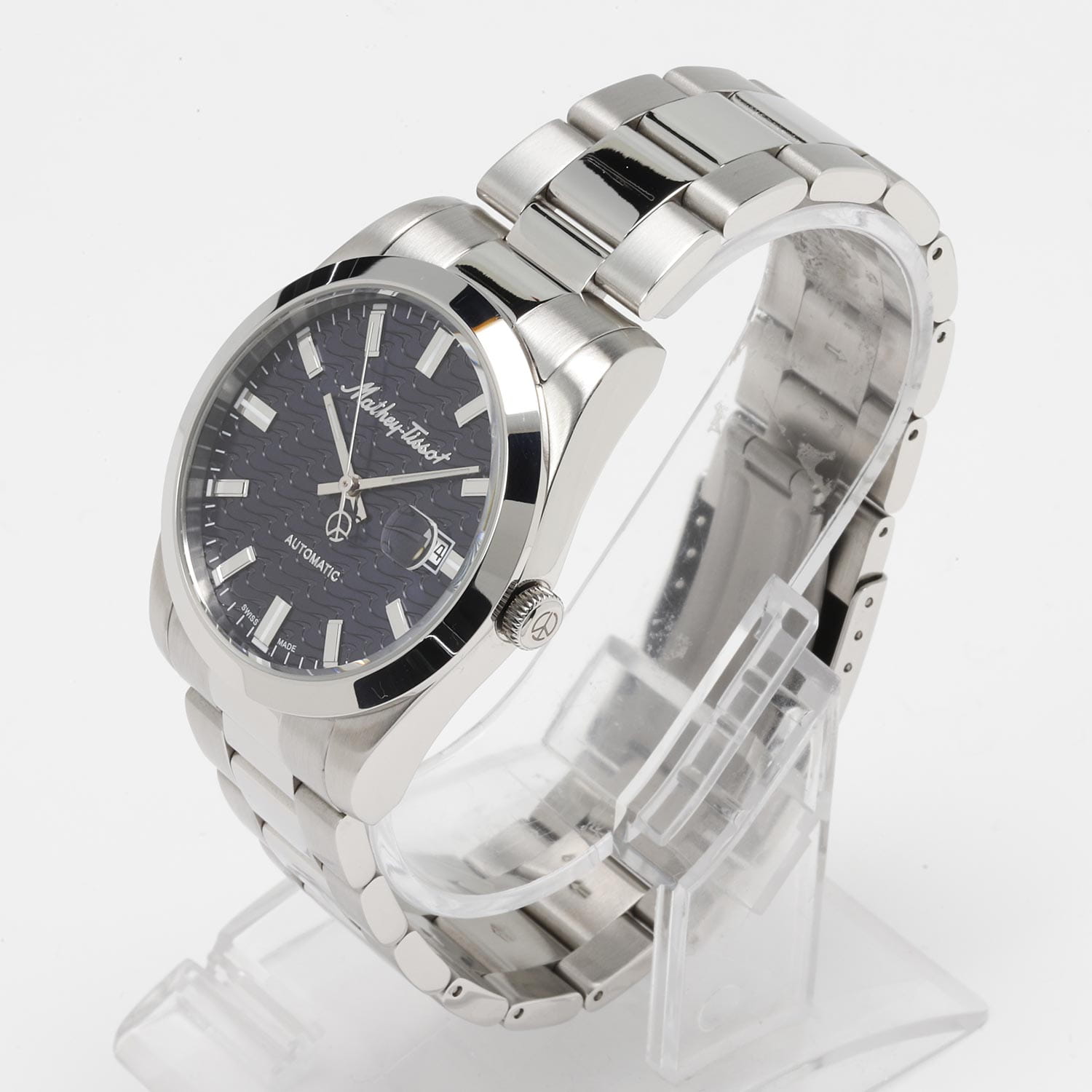 Мужские механические часы с автоподзаводом Mathey-Tissot Mathy H1450ATB — это стильное сочетание элегантности и современного дизайна. Изящный корпус выполнен из нержавеющей стали, диаметром 42 мм, что придаст образу элегантности и надежности. Изысканный циферблат с метками в виде штрихов придает модели особый блеск. Циферблат защищен минеральным стекломМинеральное стеклоМинеральное стекло представляет собой искусственно выращенный минерал кварца. Такое стекло отличается особой устойчивостью к повреждениям и царапинам. Уступает по некоторым качествам сапфировому стеклу. с сапфировым покрытием, обеспечивает устойчивость к царапинам. Стрелки и метки с люминесцентным покрытиемЛюминесцентное покрытиеПозволяет считывать показания времени в темноте. Производители наносят на стрелки, часовые индексы, безель или поверхность циферблата светонакопительный состав, дающий холодное свечение.. Окошко даты находится в положении 3 часа. Стальной браслет на раскладной застёжке с фиксаторомРаскладная застёжкаТакой тип застёжки используется только на браслетах из металла. Она никогда не раскрывается полностью, происходит разделение на 2 и более частей. Раскладывающая застёжка снизит вероятность потери часов к минимуму., гарантирует комфортное и безопасное ношение. Рифленая заводная головка. Класс водозащиты: 50 метров позволит защитить корпус от случайных брызг или капель дождя. Mathey-Tissot — отличный выбор для тех, кто ценит утонченность и качество.