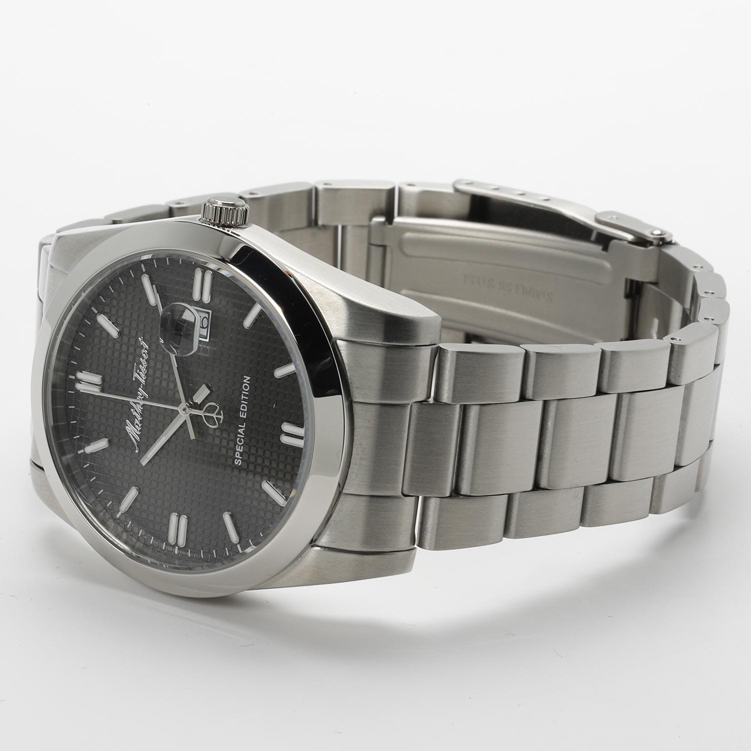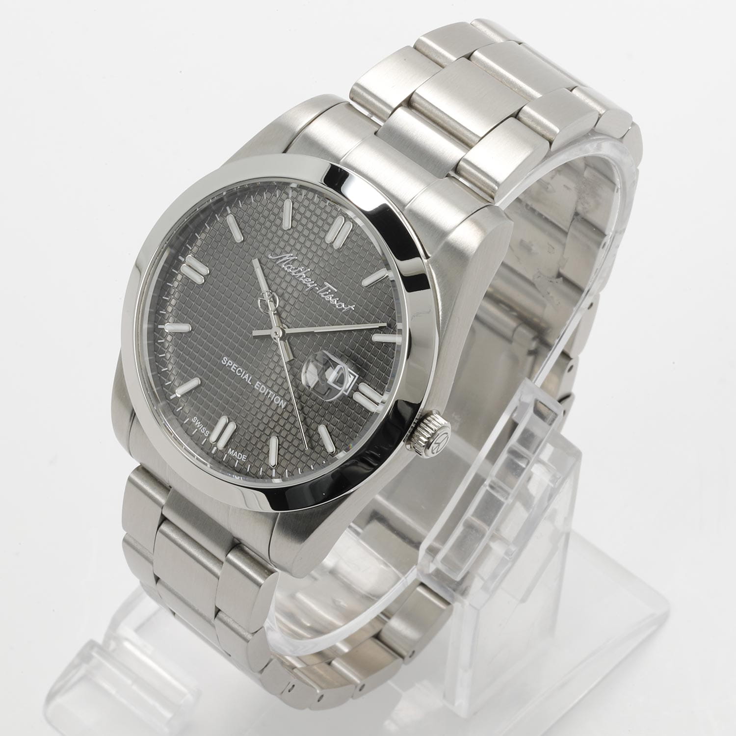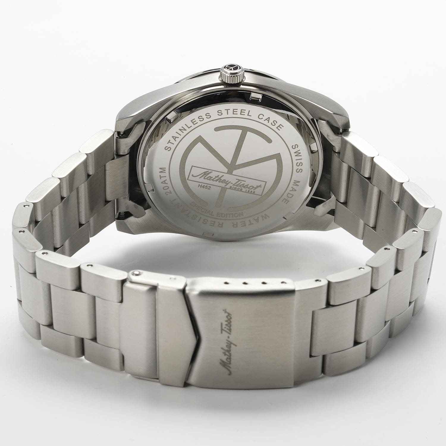 Мужские кварцевые часы Mathey-Tissot Mathy H452AS — это стильное сочетание элегантности и современного дизайна. Специальный выпуск. Изящный корпус выполнен из нержавеющей стали, диаметром 42 мм, что придаст образу элегантности и надежности. Изысканный циферблат с метками в виде штрихов придает модели особый блеск. Циферблат защищен минеральным стекломМинеральное стеклоМинеральное стекло представляет собой искусственно выращенный минерал кварца. Такое стекло отличается особой устойчивостью к повреждениям и царапинам. Уступает по некоторым качествам сапфировому стеклу. с сапфировым покрытием, обеспечивает устойчивость к царапинам. Стрелки и метки с люминесцентным покрытиемЛюминесцентное покрытиеПозволяет считывать показания времени в темноте. Производители наносят на стрелки, часовые индексы, безель или поверхность циферблата светонакопительный состав, дающий холодное свечение.. Окошко даты находится в положении 3 часа. Часы оснащены надежным кварцевым механизмом. Стальной браслет на раскладной застёжке с фиксаторомРаскладная застёжкаТакой тип застёжки используется только на браслетах из металла. Она никогда не раскрывается полностью, происходит разделение на 2 и более частей. Раскладывающая застёжка снизит вероятность потери часов к минимуму., гарантирует комфортное и безопасное ношение. Рифленая заводная головка. Класс водозащиты: 200 метров позволит плавать, нырять и заниматься другими водными видами спорта. Mathey-Tissot  — отличный выбор для тех, кто ценит утонченность и качество.