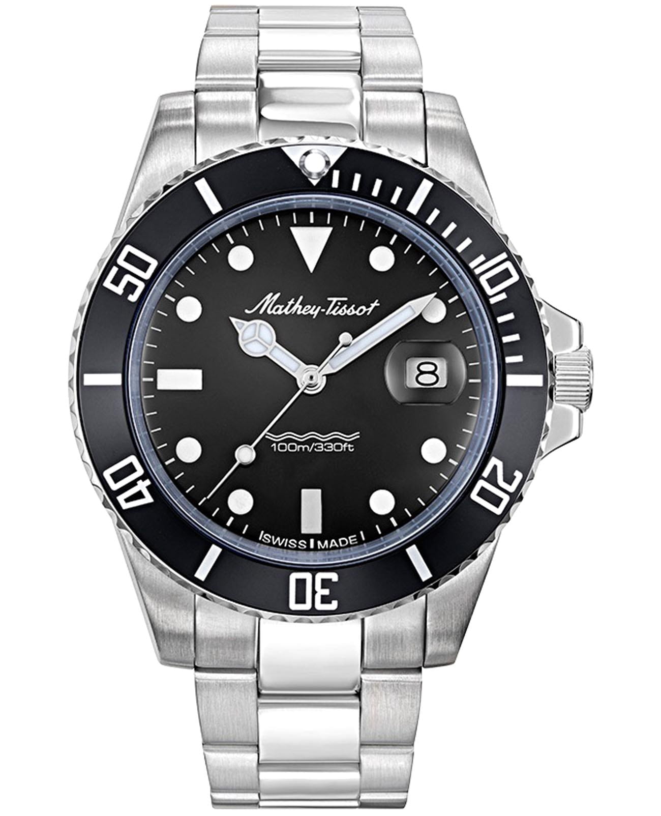 Мужские кварцевые часы Mathey-Tissot Mathy H901AN — это стильное сочетание элегантности и современного дизайна. Изящный корпус выполнен из нержавеющей стали, диаметром 42 мм, что придаст образу элегантности и надежности. Изысканный циферблат с метками в виде штрихов придает модели особый блеск. Циферблат защищен минеральным стекломМинеральное стеклоМинеральное стекло представляет собой искусственно выращенный минерал кварца. Такое стекло отличается особой устойчивостью к повреждениям и царапинам. Уступает по некоторым качествам сапфировому стеклу. с сапфировым покрытием, обеспечивает устойчивость к царапинам. Стрелки и метки с люминесцентным покрытиемЛюминесцентное покрытиеПозволяет считывать показания времени в темноте. Производители наносят на стрелки, часовые индексы, безель или поверхность циферблата светонакопительный состав, дающий холодное свечение.. БезельБезельВнешний ободок, закрепляющий стекло. В спортивных часах так называется поворотное кольцо с делениями на циферблате, выполняет роль таймера – замеряет отрезки времени на шкале. Неподвижный безель – элемент декора. Однонаправленно вращающийся безель на дайверских часах позволяет фиксировать моменты погружения и выныривания на поверхность. с PVD-покрытиемPVDУльтратонкое покрытие наносится в технике вакуумного напыления, сочетает в себе нитрид титана особой прочности со слоем золота или оксида хрома. Несёт в себе декоративную или защитную функцию. черного цвета. Окошко даты находится в положении 3 часа. Стальной браслет на раскладной застёжке с фиксаторомРаскладная застёжкаТакой тип застёжки используется только на браслетах из металла. Она никогда не раскрывается полностью, происходит разделение на 2 и более частей. Раскладывающая застёжка снизит вероятность потери часов к минимуму., гарантирует комфортное и безопасное ношение. Рифленая заводная головка. Класс водозащиты: 100 метров позволит плавать, нырять и заниматься другими водными видами спорта. Mathey-Tissot  — отличный выбор для тех, кто ценит утонченность и качество.