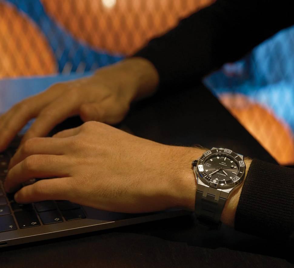 Механический механизм (автоматический калибр) с высокой точностью. Сапфировое стеклоСапфировое стеклоПрочный и надёжный материал из кристалла сапфира синтетического происхождения, характеризующийся особой твёрдостью и устойчивостью к царапинам и повреждениям. устойчивое к появлению царапин, обладающее высокой прозрачностью. Стрелки с люминесцентным покрытиемЛюминесцентное покрытиеПозволяет считывать показания времени в темноте. Производители наносят на стрелки, часовые индексы, безель или поверхность циферблата светонакопительный состав, дающий холодное свечение.. Поворотный безельБезельВнешний ободок, закрепляющий стекло. В спортивных часах так называется поворотное кольцо с делениями на циферблате, выполняет роль таймера – замеряет отрезки времени на шкале. Неподвижный безель – элемент декора. Однонаправленно вращающийся безель на дайверских часах позволяет фиксировать моменты погружения и выныривания на поверхность.. Класс водозащиты: 100 метров, позволит плавать, нырять и заниматься другими водными видами спорта. Корпус часов изготовлен из нержавеющей стали. Каучуковый ремешок с классической застежкой.