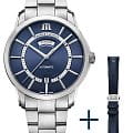 Механический механизм (автоматический калибр) с высокой точностью. Сапфировое стеклоСапфировое стеклоПрочный и надёжный материал из кристалла сапфира синтетического происхождения, характеризующийся особой твёрдостью и устойчивостью к царапинам и повреждениям. устойчивое к появлению царапин, обладающее высокой прозрачностью. Стрелки с люминесцентным покрытиемЛюминесцентное покрытиеПозволяет считывать показания времени в темноте. Производители наносят на стрелки, часовые индексы, безель или поверхность циферблата светонакопительный состав, дающий холодное свечение.. Класс водозащиты: 100 метров, позволит плавать, нырять и заниматься другими водными видами спорта. Корпус часов изготовлен из нержавеющей стали. Металлический браслет с застёжкой «бабочка» с кнопкамиЗастёжка "бабочка"Такой вид застёжки дополняется предохранителями, помогающими избежать случайного раскрытия браслета. Обладают изящным исполнением. . В комплекте кожаный ремешок.