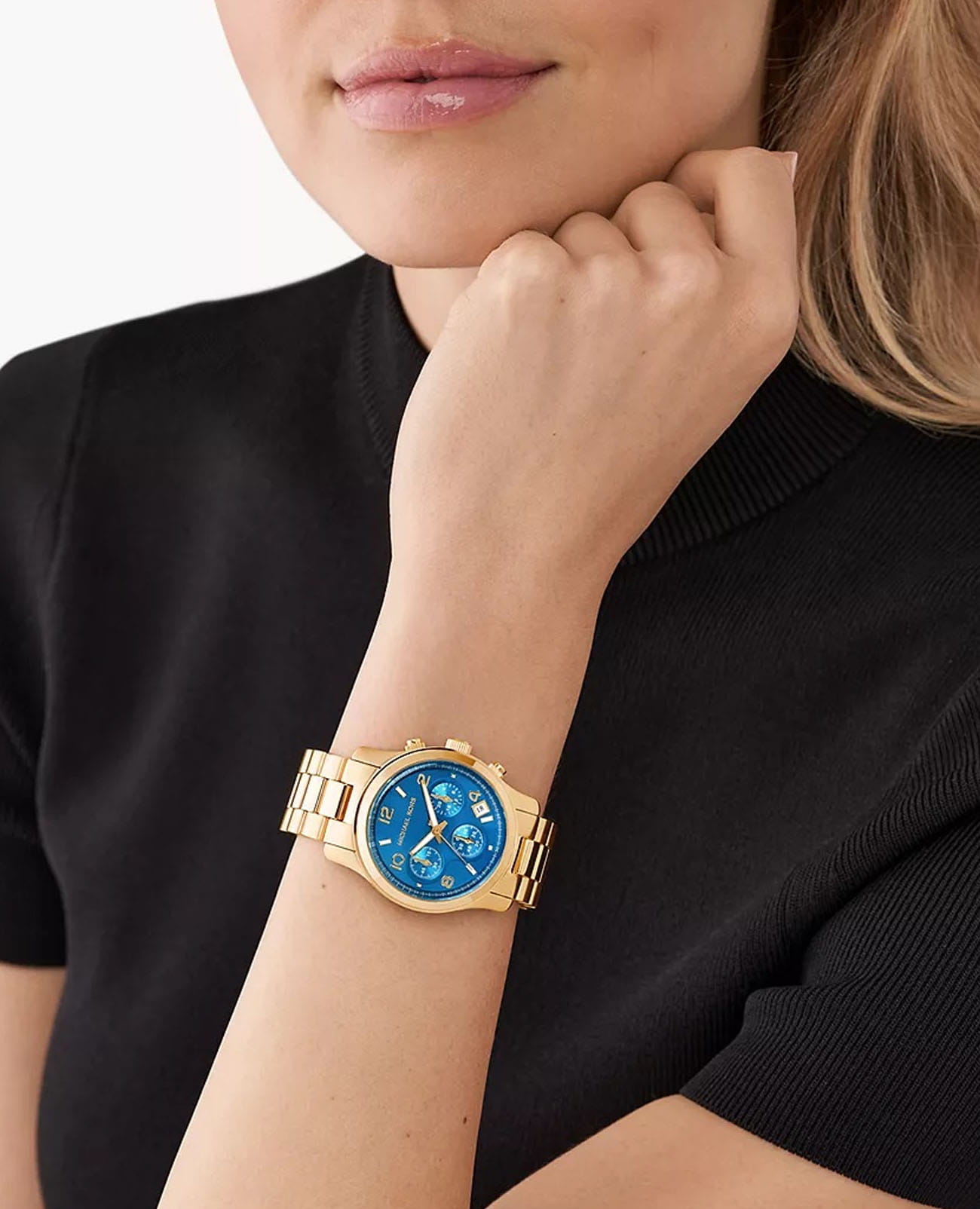 Женские часы-хронографХронографФункция позволяет измерять отрезки времени с особой точностью: часы, минуты, секунды. Верным признаком хронографа является наличие на циферблате 3 дополнительных окошек-счётчиков.  Michael Kors Runway MK7353, кварцевый механизм с высокой точностью. Минеральное стеклоМинеральное стеклоМинеральное стекло представляет собой искусственно выращенный минерал кварца. Такое стекло отличается особой устойчивостью к повреждениям и царапинам. Уступает по некоторым качествам сапфировому стеклу. устойчивое к появлению царапин, обладающее высокой прозрачностью. Корпус и браслет изготовлены из нержавеющей стали c PVDPVDУльтратонкое покрытие наносится в технике вакуумного напыления, сочетает в себе нитрид титана особой прочности со слоем золота или оксида хрома. Несёт в себе декоративную или защитную функцию. покрытием. На циферблате три дополнительных индикатора, окошко даты. Стрелки с люминесцентным покрытиемЛюминесцентное покрытиеПозволяет считывать показания времени в темноте. Производители наносят на стрелки, часовые индексы, безель или поверхность циферблата светонакопительный состав, дающий холодное свечение.. Класс водозащиты: 100 метров, позволит плавать, нырять и заниматься другими водными видами спорта. Стальной на раскладной застёжкеРаскладная застёжкаТакой тип застёжки используется только на браслетах из металла. Она никогда не раскрывается полностью, происходит разделение на 2 и более частей. Раскладывающая застёжка снизит вероятность потери часов к минимуму..