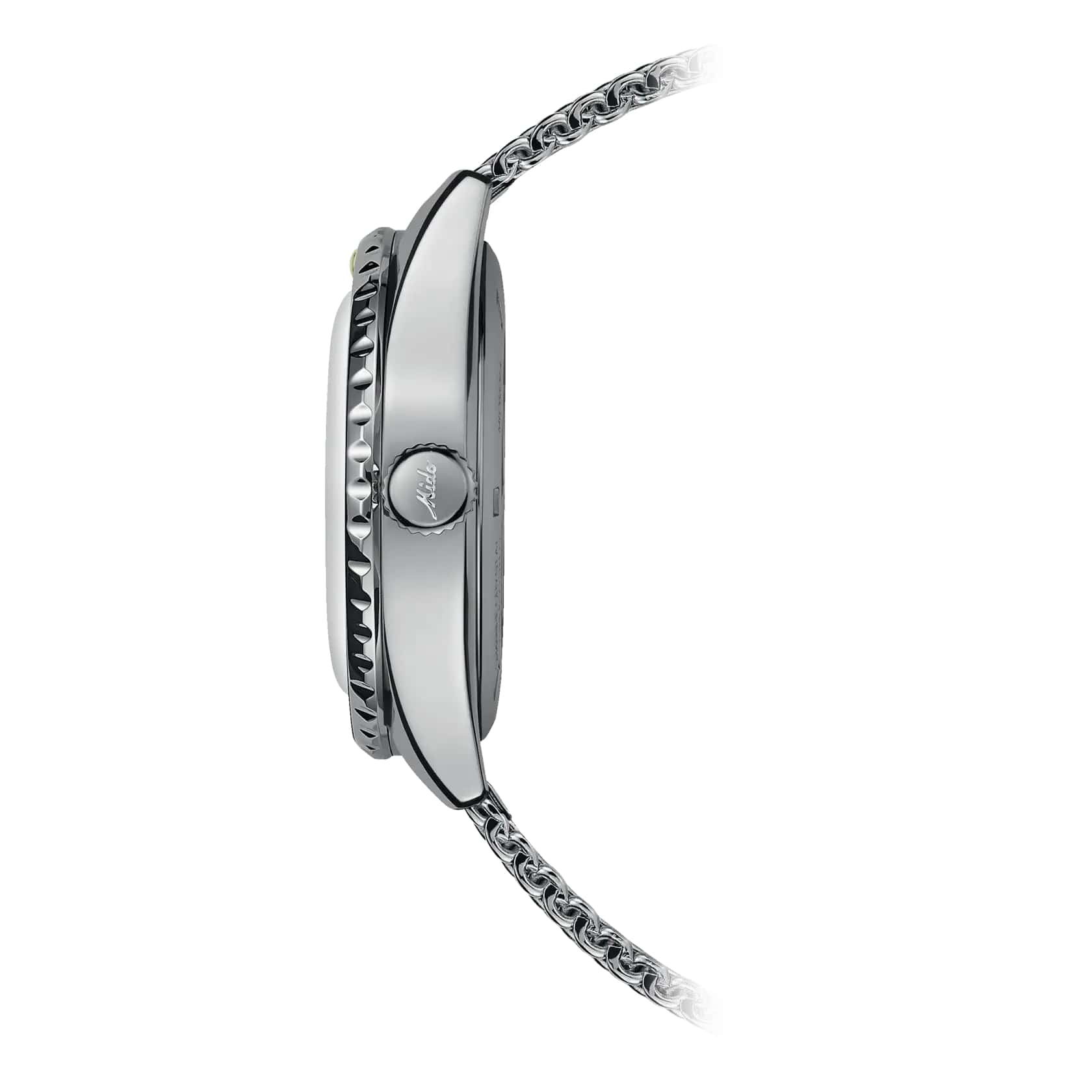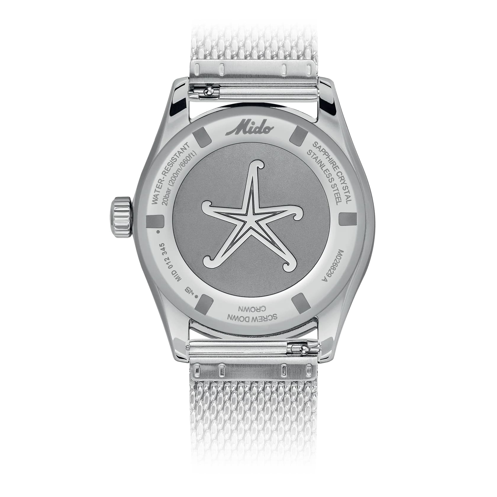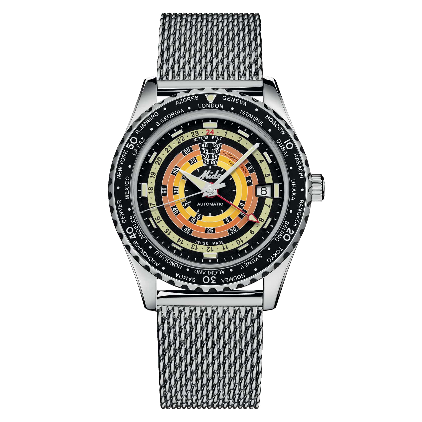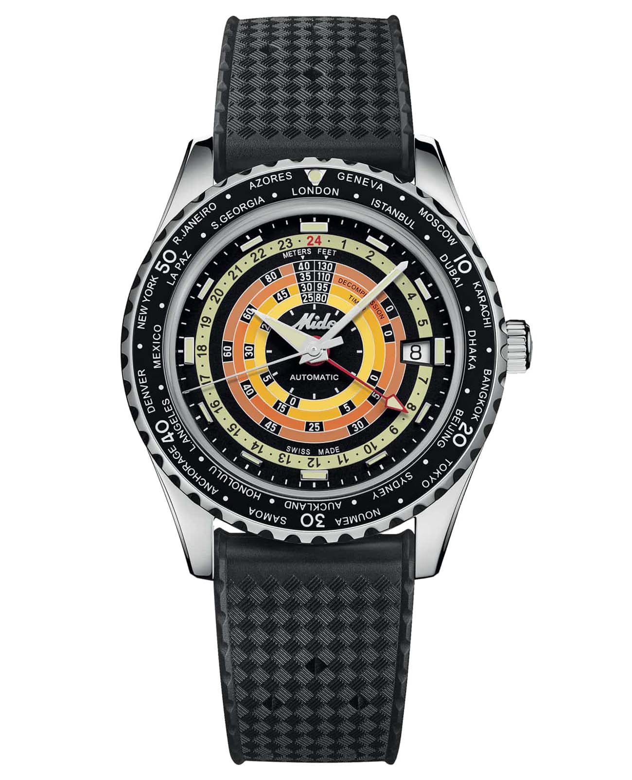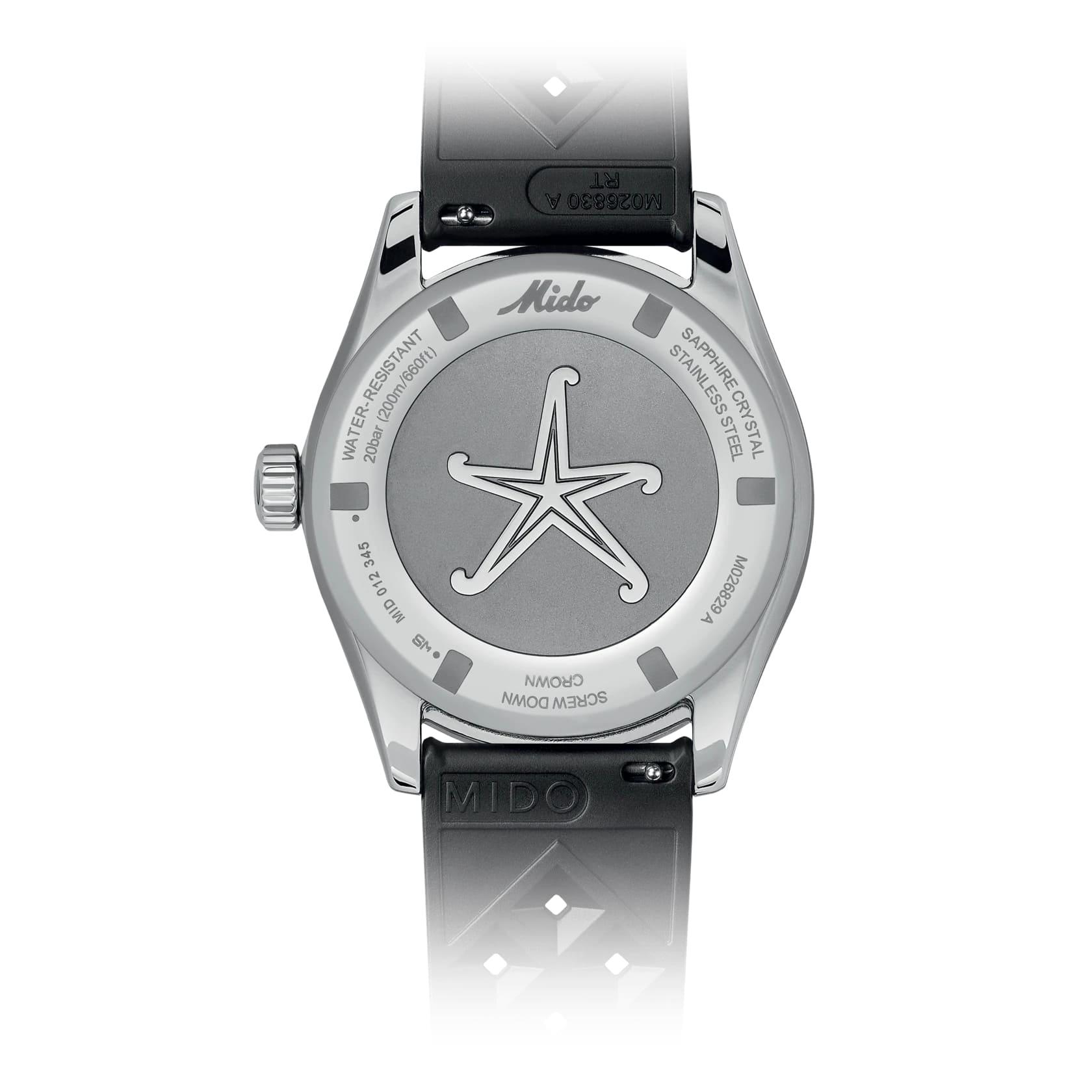 Неотразимый нео-винтажный стиль, яркие цвета и передовые технологии: новый Decompression Worldtimer Ocean Star сохраняет это винтажное очарование, а добавление дополнительного дисплея часового пояса открывает перед ним новые горизонты. В своем постоянном стремлении к совершенству Mido использовала новейшие технологии: люминесцентное покрытиеЛюминесцентное покрытиеПозволяет считывать показания времени в темноте. Производители наносят на стрелки, часовые индексы, безель или поверхность циферблата светонакопительный состав, дающий холодное свечение. Super-LumiNova®, сапфировое стеклоСапфировое стеклоПрочный и надёжный материал из кристалла сапфира синтетического происхождения, характеризующийся особой твёрдостью и устойчивостью к царапинам и повреждениям. в стиле glassbox, внушительный калибр 80 с балансировочной пружиной Nivachron™Nivachron™Специально разработанный инновационный сплав Nivachron™ повышает устойчивость часов к воздействию магнитных полей. и функцией GMTGMTОтображение времени второго часового пояса.Такая функция особенно актуальна для путешественников и бизнесменов,которые общаются с людьми из разных стран,теперь вы всегда будете знать,какой час у вашего партнёра или близкого человека., а также легко заменяемый дополнительный ремешок. На завинчивающейся задней крышке корпуса этой новой модели выгравирована морская звезда, которая водонепроницаема до давления 20 бар (200 м/660 футов).