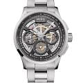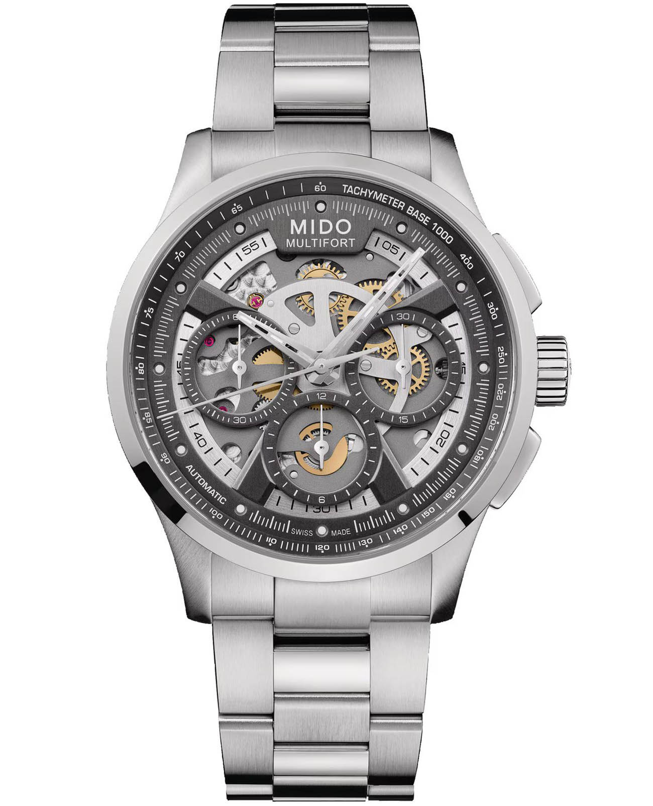Швейцарские мужские наручные часы Mido Multifort Skeleton Chronograph M038.662.11.060.00, механический механизм с высокой точностью. Циферблат c сапфировым стекломСапфировое стеклоПрочный и надёжный материал из кристалла сапфира синтетического происхождения, характеризующийся особой твёрдостью и устойчивостью к царапинам и повреждениям., устойчивым к появлению царапин и обладающее высокой прозрачностью. Часы оснащены люминесцентным покрытиемЛюминесцентное покрытиеПозволяет считывать показания времени в темноте. Производители наносят на стрелки, часовые индексы, безель или поверхность циферблата светонакопительный состав, дающий холодное свечение., обеспечивающим отличную видимость даже при слабом освещении. Класс водозащиты: 100 метров, позволит плавать, нырять и заниматься другими водными видами спорта. Корпус часов изготовлен из стали. Часы с балансом из Nivachron™Nivachron™Специально разработанный инновационный сплав Nivachron™ повышает устойчивость часов к воздействию магнитных полей., обеспечивающим высокую устойчивость к магнитным полям и ударам. Часы с функциями хронографаХронографФункция позволяет измерять отрезки времени с особой точностью: часы, минуты, секунды. Верным признаком хронографа является наличие на циферблате 3 дополнительных окошек-счётчиков. и тахиметраТахиметрРазмеченная шкала, располагается на ободке или безеле часов. Тахиметр позволяет рассчитать скорость на определённом участке пути, расстояние измеряется в километрах или милях.. Браслет из стали с раскладной застёжкойРаскладная застёжкаТакой тип застёжки используется только на браслетах из металла. Она никогда не раскрывается полностью, происходит разделение на 2 и более частей. Раскладывающая застёжка снизит вероятность потери часов к минимуму. обеспечивает комфортное ношение.