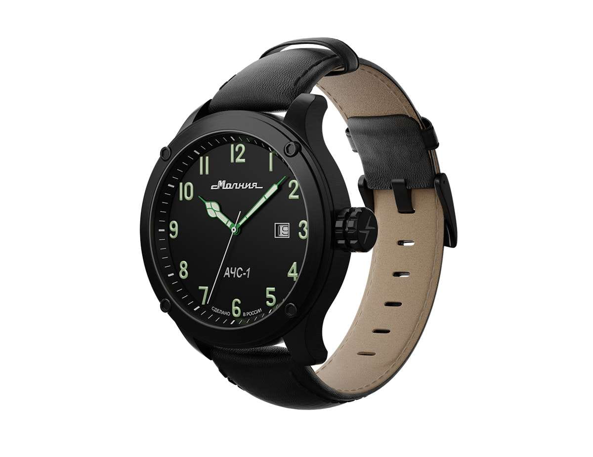Мужские механические часы с автоподзаводом — это надёжный аксессуар от легендарного бренда «МОЛНИЯ», созданного на Челябинском часовом заводе. Корпус диаметром 44 мм и высотой 12 мм выполнен из нержавеющей стали 316L с IP-покрытиемIP-покрытиеМетод ионного напыления. Демонстрирует повышенную устойчивость к истиранию, окислению и химическим веществам. Под воздействием высокого давления и температуры около 1500°C молекулы металла надёжно соединяются с частицами корпуса часов.. Циферблат чёрного цвета матовый, оформлен стрелками и индексами с люминесцентным покрытиемЛюминесцентное покрытиеПозволяет считывать показания времени в темноте. Производители наносят на стрелки, часовые индексы, безель или поверхность циферблата светонакопительный состав, дающий холодное свечение. Super-LumiNova. Окошко даты расположено в положении 3 часов. Циферблат защищён сапфировым стекломСапфировое стеклоПрочный и надёжный материал из кристалла сапфира синтетического происхождения, характеризующийся особой твёрдостью и устойчивостью к царапинам и повреждениям. толщиной 1,5 мм. Механизм — японский автоматический калибр Miyota 8215 с функцией и запасом хода 42 часа. Часы оснащены кожаным ремешком чёрного цвета шириной 22 мм с классической пряжкой. Водонепроницаемость 100 м позволяет использовать часы для плавания и повседневного ношения. Идеальный выбор для тех, кто ценит российское качество и мужественный дизайн.