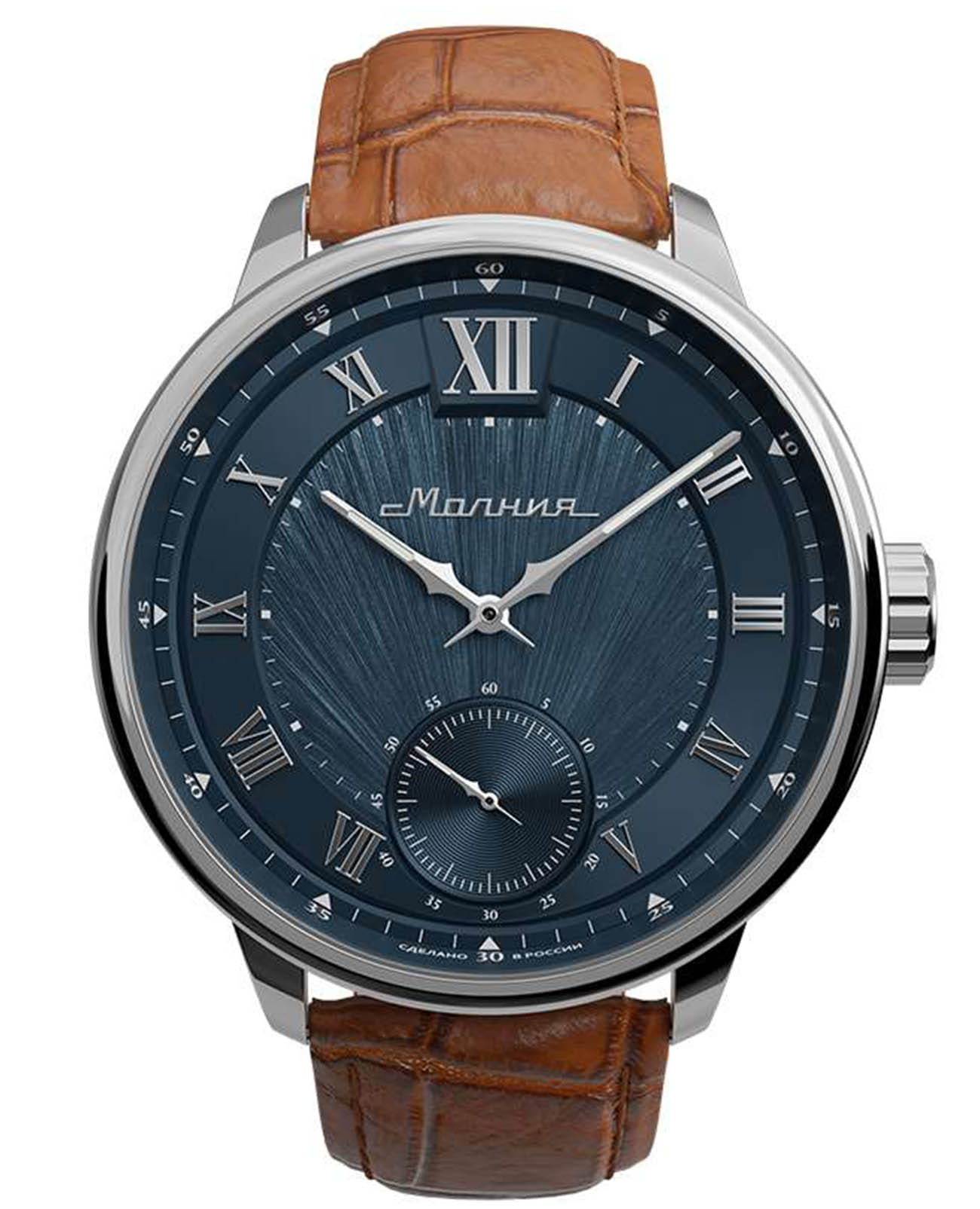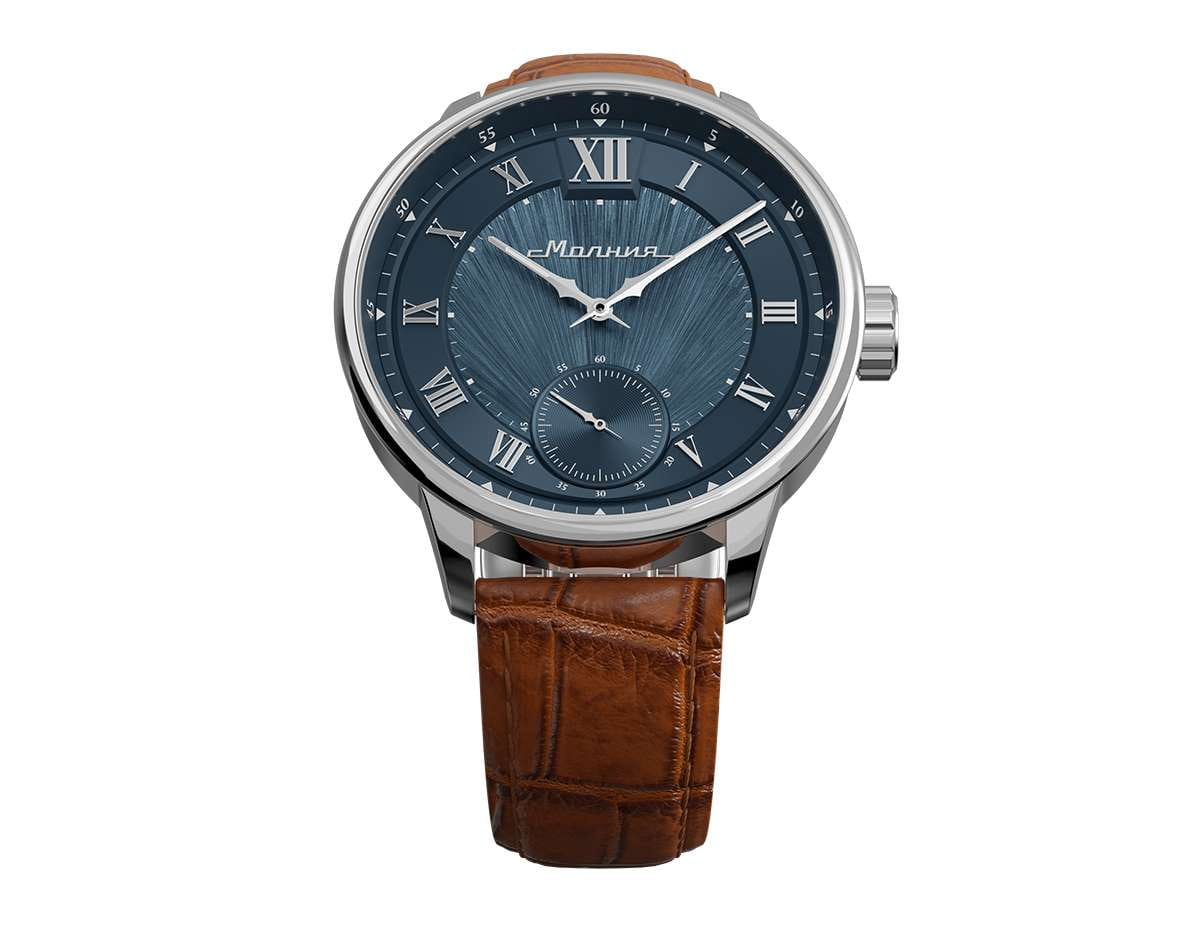 Мужские механические часы с ручным подзаводом — это аксессуар от легендарного бренда «МОЛНИЯ», созданный на Челябинском часовом заводе. Корпус диаметром 41 мм и толщиной 12 мм выполнен из нержавеющей стали 316L с зеркальной полировкой. БезельБезельВнешний ободок, закрепляющий стекло. В спортивных часах так называется поворотное кольцо с делениями на циферблате, выполняет роль таймера – замеряет отрезки времени на шкале. Неподвижный безель – элемент декора. Однонаправленно вращающийся безель на дайверских часах позволяет фиксировать моменты погружения и выныривания на поверхность. также выполнен из стали с зеркальной отделкой. Циферблат синего цвета оформлен римскими цифрами и стальными индексами. Малая секундная стрелка вынесена на позицию 6 часов. Циферблат защищён сапфировым стекломСапфировое стеклоПрочный и надёжный материал из кристалла сапфира синтетического происхождения, характеризующийся особой твёрдостью и устойчивостью к царапинам и повреждениям. толщиной 2,5 мм. Механизм — мануфактурный калибр 3603, собранный вручную, с запасом хода до 40 часов. Прозрачная задняя крышка позволяет наблюдать за работой механизма. Часы оснащены светло-коричневым кожаным ремешком шириной 20 мм с раскладной застёжкойРаскладная застёжкаТакой тип застёжки используется только на браслетах из металла. Она никогда не раскрывается полностью, происходит разделение на 2 и более частей. Раскладывающая застёжка снизит вероятность потери часов к минимуму. и системой быстрой замены. Водонепроницаемость 100 м позволяет использовать часы для плавания и повседневного ношения. Идеальный выбор для тех, кто ценит российское качество и традиции.