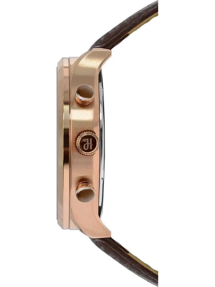 Ремешок выполнен из комбинации кожи и текстиля, обеспечивая комфорт при носке и добавляя модели уникальный внешний вид. Толщина корпуса составляет 13 мм, что придаёт часам солидный вид.