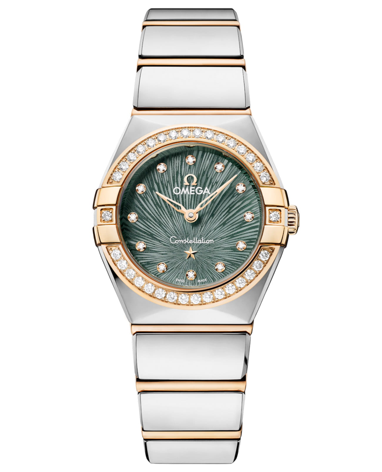 Moonshine™ украшена безелемБезельВнешний ободок, закрепляющий стекло. В спортивных часах так называется поворотное кольцо с делениями на циферблате, выполняет роль таймера – замеряет отрезки времени на шкале. Неподвижный безель – элемент декора. Однонаправленно вращающийся безель на дайверских часах позволяет фиксировать моменты погружения и выныривания на поверхность. с бриллиантовой россыпью, сверкающей подобно созвездию. Циферблат оттенка зеленой сосны с PVDPVDУльтратонкое покрытие наносится в технике вакуумного напыления, сочетает в себе нитрид титана особой прочности со слоем золота или оксида хрома. Несёт в себе декоративную или защитную функцию.-покрытием демонстрирует узор Supernova, где каждая линия, созданная методом электрохимического травления, повторяет траекторию падающей звезды. Стрелки и звезда Constellation из 18-каратного золота18-каратное золотоОбозначение по каратной системе пробирования, оно показывает, сколько драгоценного металла содержится в изделии. 18 карат - в составе 75% чистого золота, соответствует 750 пробе.