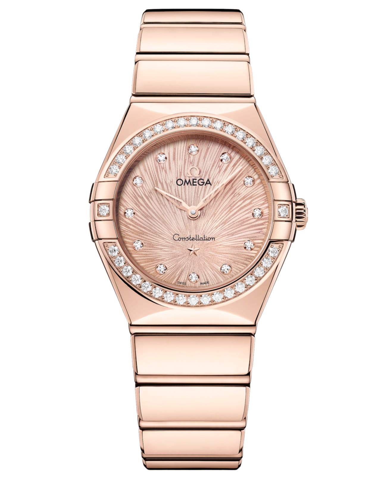 Часы OMEGA Constellation, словно частица ночного неба, застывшая в золоте, воплощают космическую элегантность в своем узнаваемом корпусе с плавными полукруглыми гранями и зеркальными скобами, напоминающими отблески далеких звезд. Эта изысканная 28-миллиметровая модель из 18-каратного золота18-каратное золотоОбозначение по каратной системе пробирования, оно показывает, сколько драгоценного металла содержится в изделии. 18 карат - в составе 75% чистого золота, соответствует 750 пробе.
