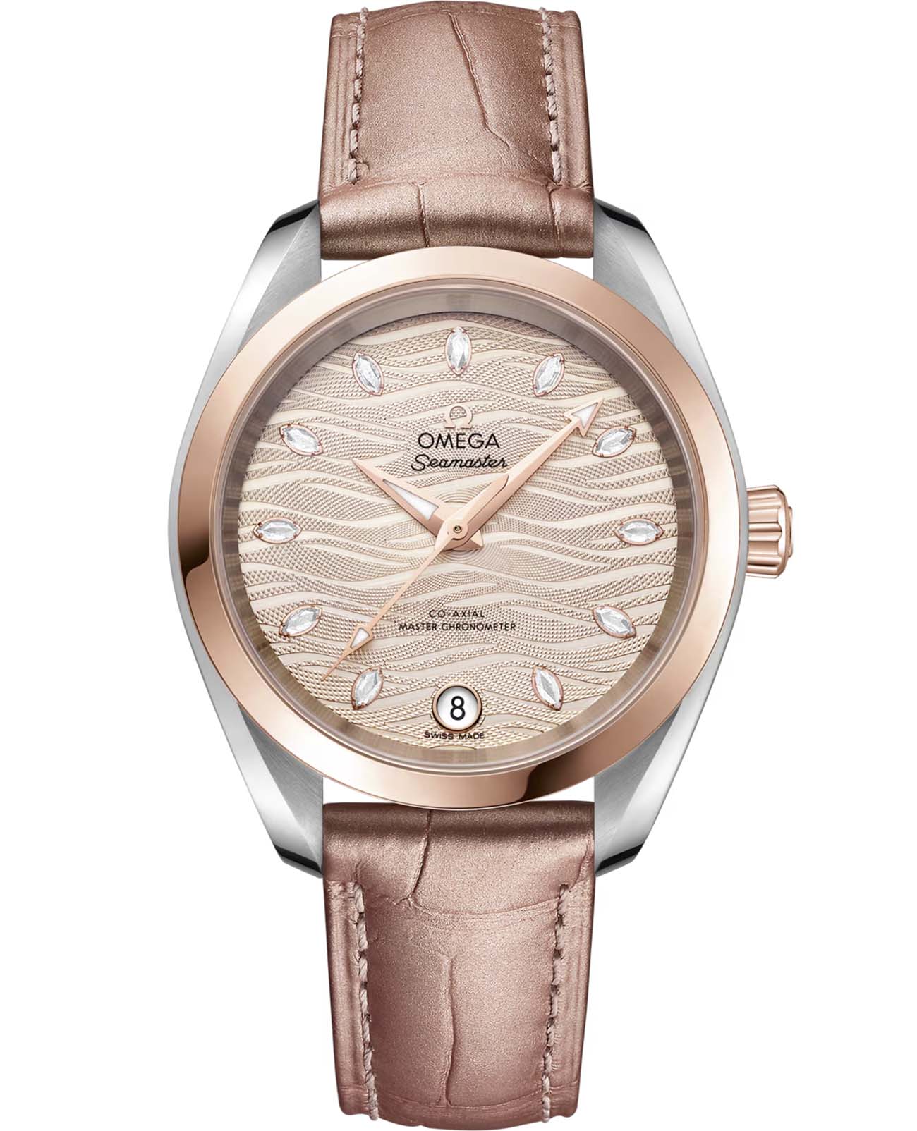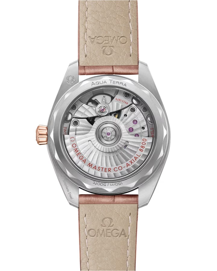 Omega Seamaster Aqua Terra выполнены в симметричном корпусе из нержавеющей стали и 18K Sedna™ золота с завинчивающейся задней крышкой, украшенной волновым узором. Циферблат дополнен окошком даты на 6 часах и 11 часами в виде маркизных бриллиантов, что добавляет модели роскошный акцент. Стрелки и метки выполнены из 18K Sedna™ золота и оснащены люминесцентным покрытиемЛюминесцентное покрытиеПозволяет считывать показания времени в темноте. Производители наносят на стрелки, часовые индексы, безель или поверхность циферблата светонакопительный состав, дающий холодное свечение. Super-LumiNova для лучшей читаемости в темноте. Калибр Omega 8800 сертифицирован как Master Chronometer — гарантия высочайшей точности и устойчивости к магнитным полям. Запас хода составляет 55 часов. Защиту циферблата обеспечивает сапфировое стеклоСапфировое стеклоПрочный и надёжный материал из кристалла сапфира синтетического происхождения, характеризующийся особой твёрдостью и устойчивостью к царапинам и повреждениям. с антибликовым покрытиемАнтибликовое покрытиеСлой оксида металла в 0,13-0,3 микрон, благодаря которому стекло часов не бликует и не отражает свет. Антибликовое покрытие уменьшает отражение света в 10 раз, обеспечивая отличную читаемость показателей циферблата. с обеих сторон. Водозащита позволяет использовать часы в воде без риска повреждения. Часы установлены на кожаный ремешок бежевого цвета. Вес модели — около 65 граммов. Это сочетание премиального качества, технологичности и классического дизайна.