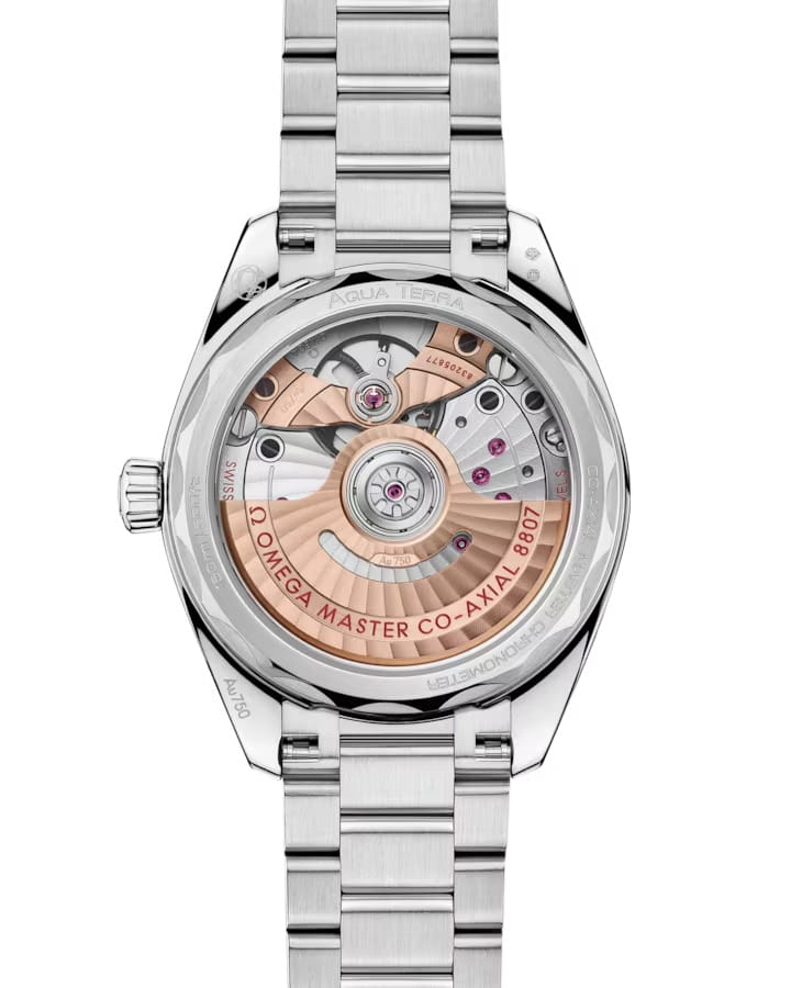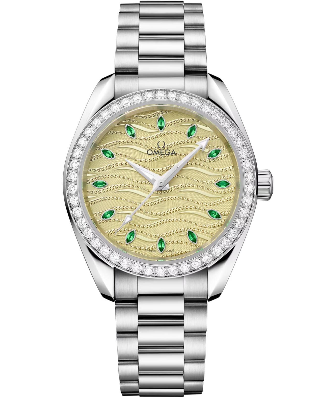 Часы Omega Seamaster Aqua Terra выполнены в симметричном корпусе из полированного 18K Canopus Gold™ с завинчивающейся задней крышкой, украшенной волновым узором. Безель инкрустирован бриллиантами, что добавляет модели роскошный акцент. Циферблат зелёного цвета обработан методом PVD и дополнен ручной гравировкой guilloché, а также 12 часовыми метками из тсаварита. Стрелки выполнены из белого золота и оснащены люминесцентным покрытиемЛюминесцентное покрытиеПозволяет считывать показания времени в темноте. Производители наносят на стрелки, часовые индексы, безель или поверхность циферблата светонакопительный состав, дающий холодное свечение. Super-LumiNova для лучшей читаемости в темноте. Калибр Omega 8807 сертифицирован как Master Chronometer — гарантия высочайшей точности и устойчивости к магнитным полям. Запас хода составляет 55 часов. Защиту циферблата обеспечивает сапфировое стеклоСапфировое стеклоПрочный и надёжный материал из кристалла сапфира синтетического происхождения, характеризующийся особой твёрдостью и устойчивостью к царапинам и повреждениям. с антибликовым покрытиемАнтибликовое покрытиеСлой оксида металла в 0,13-0,3 микрон, благодаря которому стекло часов не бликует и не отражает свет. Антибликовое покрытие уменьшает отражение света в 10 раз, обеспечивая отличную читаемость показателей циферблата. с обеих сторон. Водозащита позволяет использовать часы в воде без риска повреждения. Часы установлены на браслет из 18K Canopus Gold™ с закруглёнными звеньями и раскладной застёжкойРаскладная застёжкаТакой тип застёжки используется только на браслетах из металла. Она никогда не раскрывается полностью, происходит разделение на 2 и более частей. Раскладывающая застёжка снизит вероятность потери часов к минимуму.. Это сочетание премиального качества, технологичности и классического дизайна.