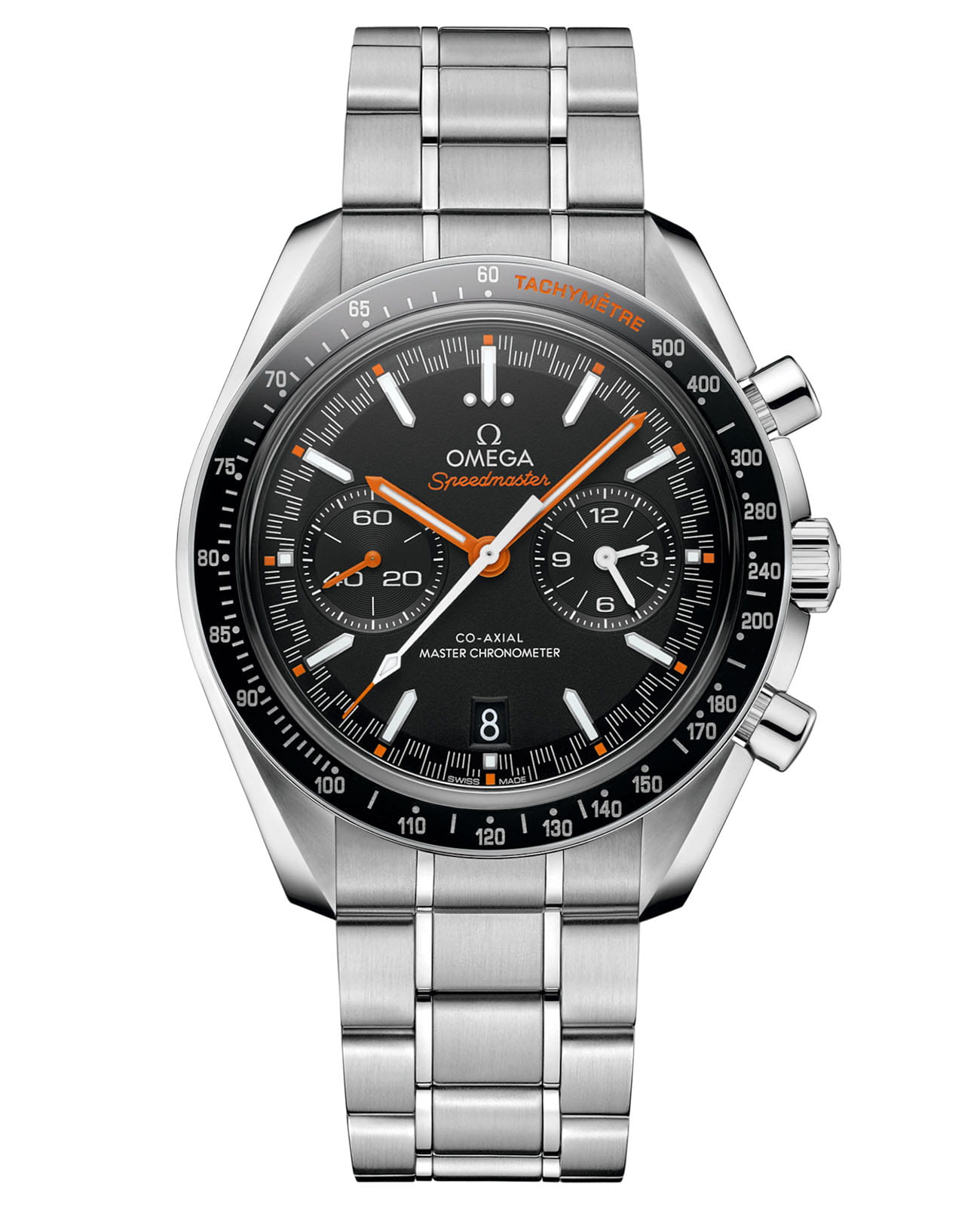 Speedmaster Racing Master Chronometer в 44,25-мм корпусе с браслетом из нержавеющей стали воплощает гоночную эстетику. Черное керамическое кольцоБезельВнешний ободок, закрепляющий стекло. В спортивных часах так называется поворотное кольцо с делениями на циферблате, выполняет роль таймера – замеряет отрезки времени на шкале. Неподвижный безель – элемент декора. Однонаправленно вращающийся безель на дайверских часах позволяет фиксировать моменты погружения и выныривания на поверхность. с тахиметрической шкалойТахиметрРазмеченная шкала, располагается на ободке или безеле часов. Тахиметр позволяет рассчитать скорость на определённом участке пути, расстояние измеряется в километрах или милях. сочетает оранжевые надписи с цифрами из Liquidmetal™. Матовый черный циферблат с "спидометрной" минутной шкалой дополнен индексами из белого золота18-каратное золотоОбозначение по каратной системе пробирования, оно показывает, сколько драгоценного металла содержится в изделии. 18 карат - в составе 75% чистого золота, соответствует 750 пробе.