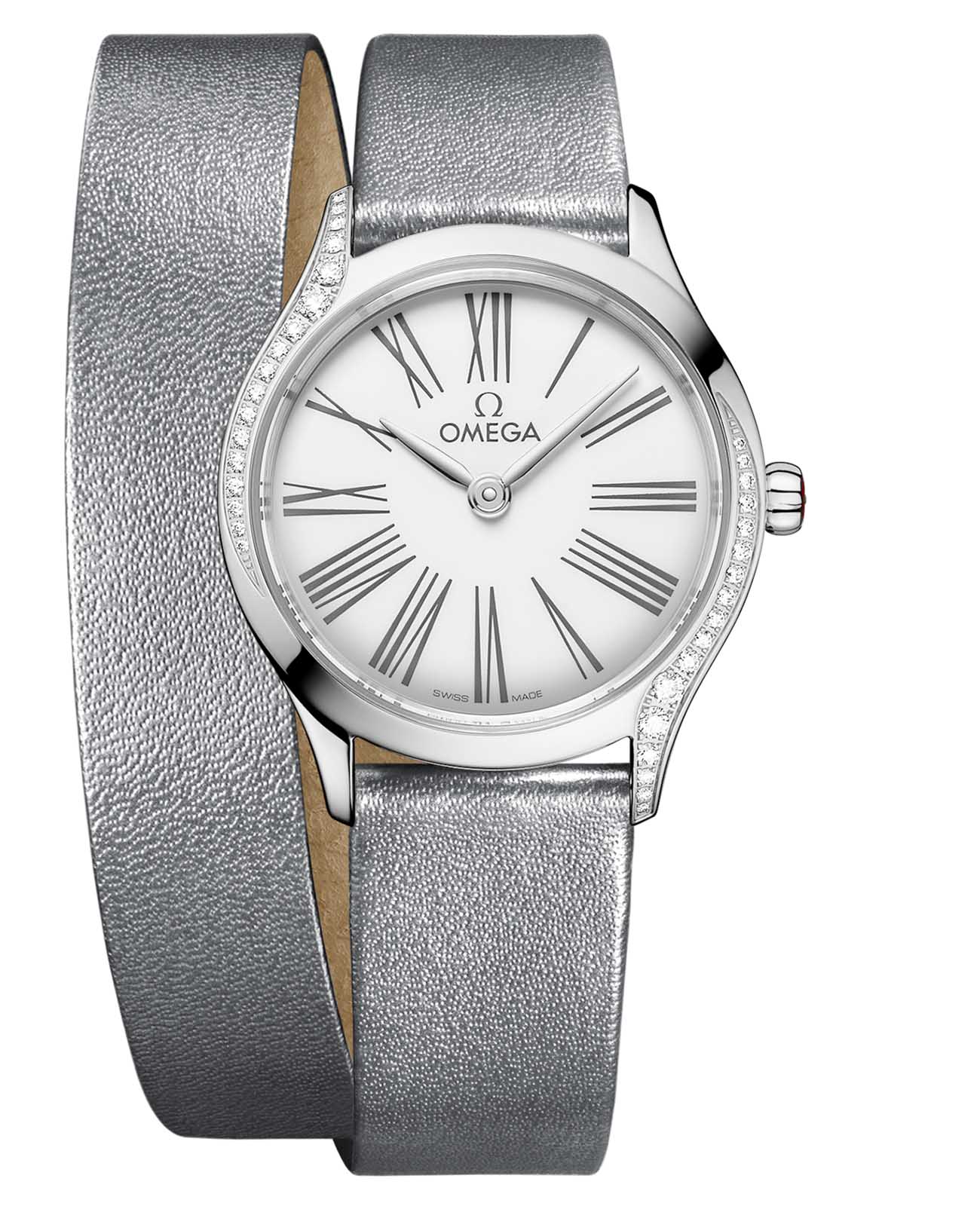Mini Trésor — сияющий шедевр женской коллекции OMEGA, где 26-мм корпус из нержавеющей стали украшен волнообразными рядами бриллиантов, а заводная головка с алмазом в обрамлении красной гибридной керамики добавляет дерзкий акцент. Куполообразный циферблат из белой эмали "Grand Feu" с сероватым оттенком и изящными римскими цифрами создает эффект парящей легкости. Двойной переливающийся кожаный ремешок серого цвета с фирменной застежкой Trésor подчеркивает утонченный характер модели. Внутри скрыт точный кварцевый механизм OMEGA 4061, дополненный зеркальной задней крышкой с металлизированным узором "Her Time" — воплощение современной женственности и часового мастерства.