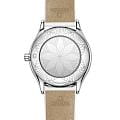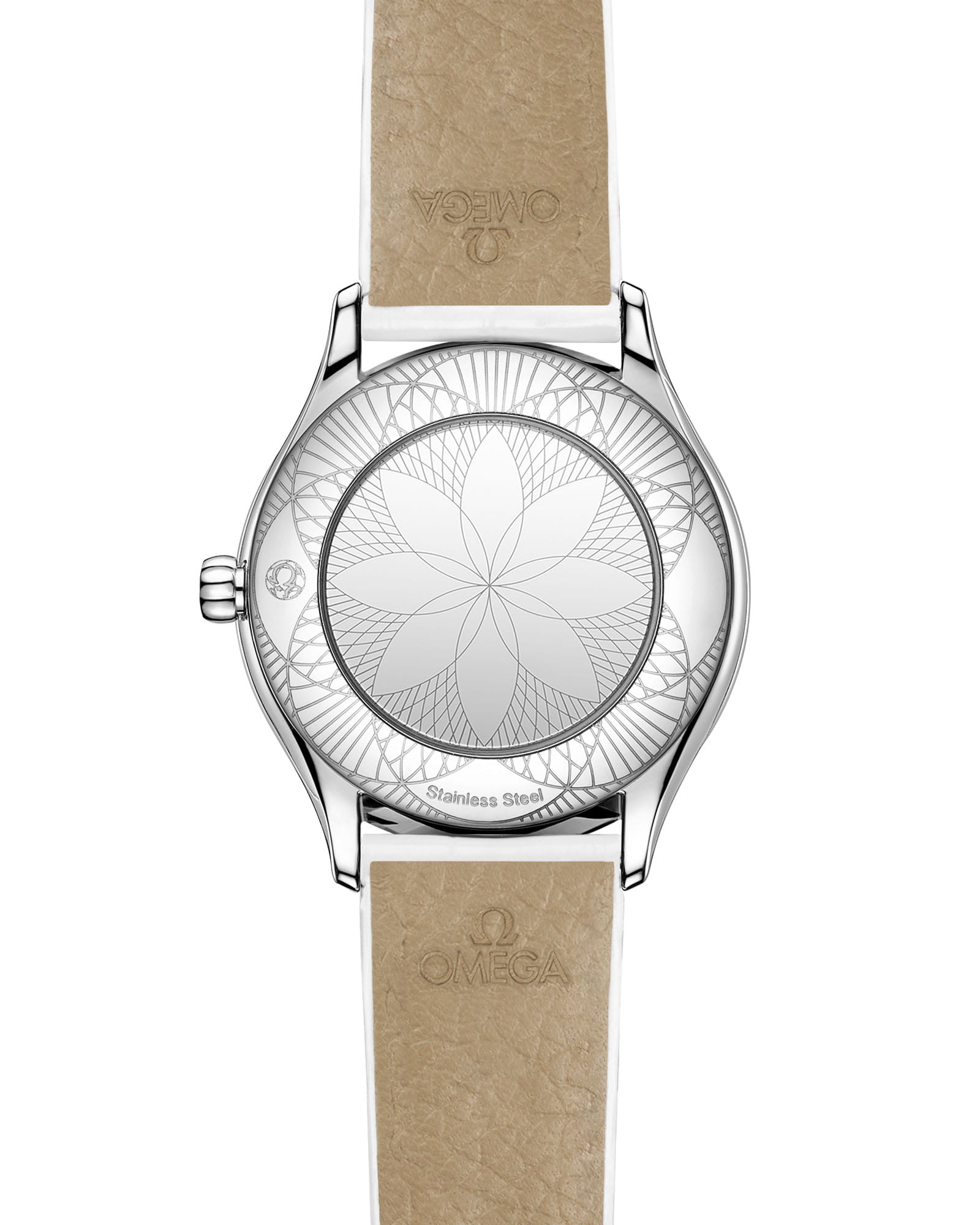 Mini Trésor — воплощение современной женственности в миниатюрном 26-мм корпусе из нержавеющей стали, где каждый миллиметр продуман до совершенства. Боковые поверхности украшены элегантными рядами бриллиантов, а заводная головка с алмазом обрамлена цветком из красной гибридной керамики, добавляя ноту игривого очарования. Куполообразный циферблат из белой эмали "Grand Feu" с сероватым оттенком и серыми римскими цифрами создает эффект воздушной легкости. Двойной ремешок из лакированной телячьей кожи с ромбовидным стеганым узором подчеркивает изысканность модели. Внутри бьется точный кварцевый механизм OMEGA 4061, скрытый за зеркальной задней крышкой с фирменным узором "Her Time" — истинное ювелирное произведение на запястье.