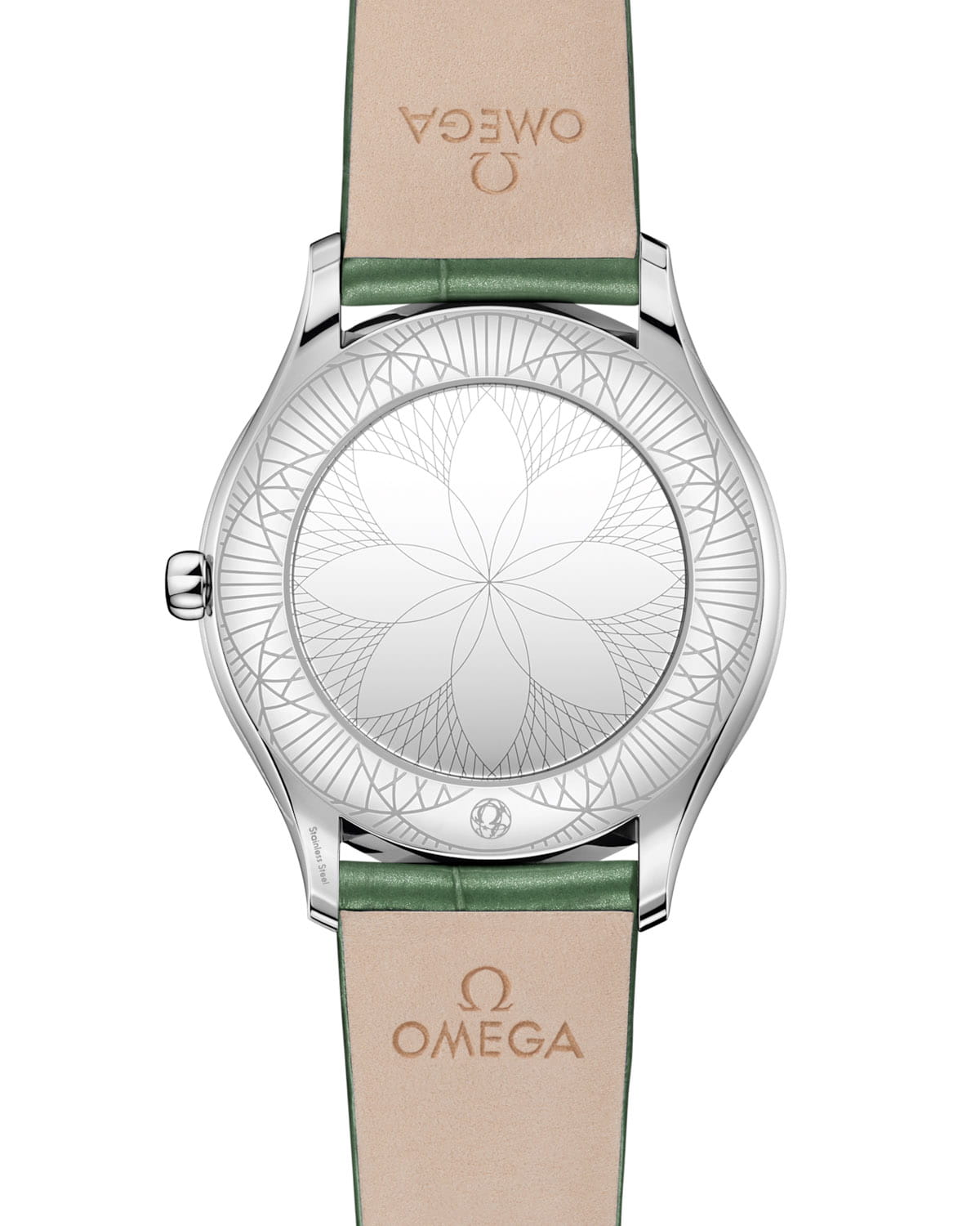 OMEGA Trésor с цветочным вдохновением — это поэтичное сочетание ювелирного искусства и природной гармонии. 36-мм корпус из полированной нержавеющей стали, украшенный 38 бриллиантами (0,49 карата), словно роса на лепестках, переливается при каждом движении. Под выпуклым сапфировым стекломСапфировое стеклоПрочный и надёжный материал из кристалла сапфира синтетического происхождения, характеризующийся особой твёрдостью и устойчивостью к царапинам и повреждениям. раскрывается циферблат с зеленым PVD-покрытиемPVDУльтратонкое покрытие наносится в технике вакуумного напыления, сочетает в себе нитрид титана особой прочности со слоем золота или оксида хрома. Несёт в себе декоративную или защитную функцию. и изысканным лазерным узором жасмина — символом чистоты и изящества. Заводная головка с бриллиантом и родиевые стрелки добавляют благородный блеск. Переливающийся зеленый кожаный ремешок с застежкой из стали завершает образ, а зеркальная задняя крышка с узором "Her Time" скрывает точный кварцевый механизм OMEGA 4061 — воплощение женственности и часового мастерства.