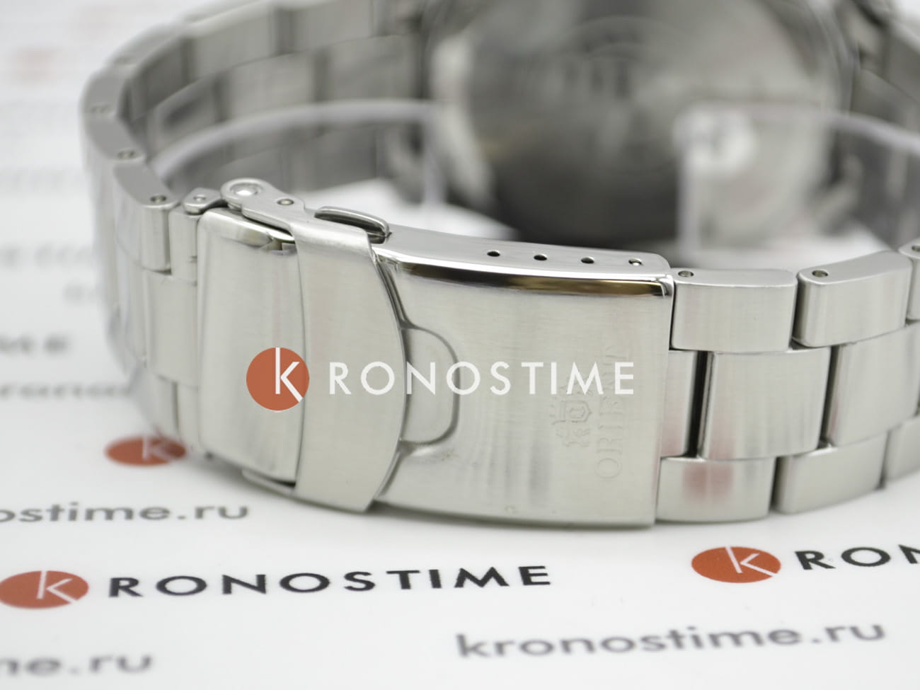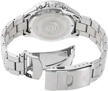 Браслет часов изготовлен из нержавеющей стали и имеет ширину 22 мм. Застёжка выполнена в виде раскладной конструкцииРаскладная застёжкаТакой тип застёжки используется только на браслетах из металла. Она никогда не раскрывается полностью, происходит разделение на 2 и более частей. Раскладывающая застёжка снизит вероятность потери часов к минимуму. с кнопочным замком, что обеспечивает удобство и надёжную фиксацию на запястье. Часы оснащены однонаправленным вращающимся безeлемБезельВнешний ободок, закрепляющий стекло. В спортивных часах так называется поворотное кольцо с делениями на циферблате, выполняет роль таймера – замеряет отрезки времени на шкале. Неподвижный безель – элемент декора. Однонаправленно вращающийся безель на дайверских часах позволяет фиксировать моменты погружения и выныривания на поверхность. с PVD-покрытиемPVDУльтратонкое покрытие наносится в технике вакуумного напыления, сочетает в себе нитрид титана особой прочности со слоем золота или оксида хрома. Несёт в себе декоративную или защитную функцию., что повышает его износостойкость и добавляет стильный акцент. БезельБезельВнешний ободок, закрепляющий стекло. В спортивных часах так называется поворотное кольцо с делениями на циферблате, выполняет роль таймера – замеряет отрезки времени на шкале. Неподвижный безель – элемент декора. Однонаправленно вращающийся безель на дайверских часах позволяет фиксировать моменты погружения и выныривания на поверхность. имеет 120 щелчков, что делает его удобным для использования в дайвинге.