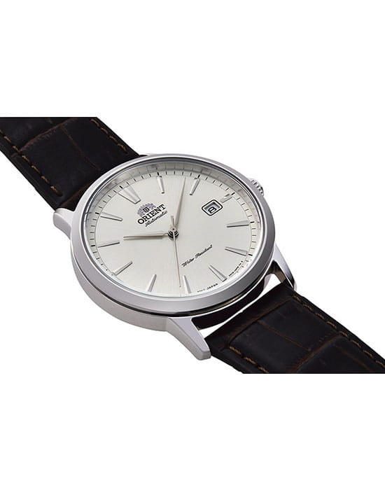 Orient RA-AC0F07S — элегантные мужские часы, сочетающие классический дизайн и современные технологии. Корпус диаметром 41,6 мм и толщиной 11,7 мм выполнен из нержавеющей стали, обеспечивая долговечность и стильный внешний вид. Серебристый циферблат с лаконичными метками и стрелками защищён минеральным стекломМинеральное стеклоМинеральное стекло представляет собой искусственно выращенный минерал кварца. Такое стекло отличается особой устойчивостью к повреждениям и царапинам. Уступает по некоторым качествам сапфировому стеклу., устойчивым к царапинам. Часы оснащены автоматическим механизмом Orient с калибром F6722, поддерживающим как автоподзавод, так и ручной завод, а также функцией остановки секундной стрелки для точной настройки времени. Функциональность включает индикацию часов, минут, секунд и даты, расположенной в окне на отметке «3 часа». Водозащита до 50 метров (5 бар) делает модель подходящей для повседневного использования, защищая её от случайных брызг. Ремешок выполнен из коричневой натуральной кожи и оснащён классической застёжкой, обеспечивающей комфортное ношение и надёжную фиксацию на запястье.