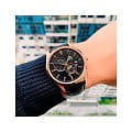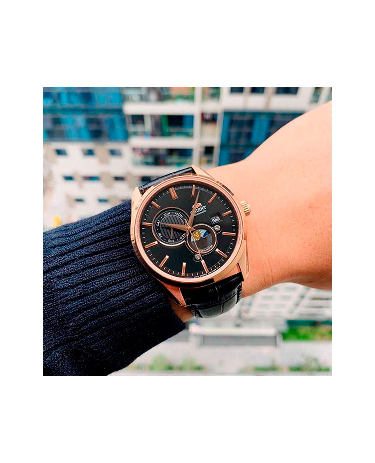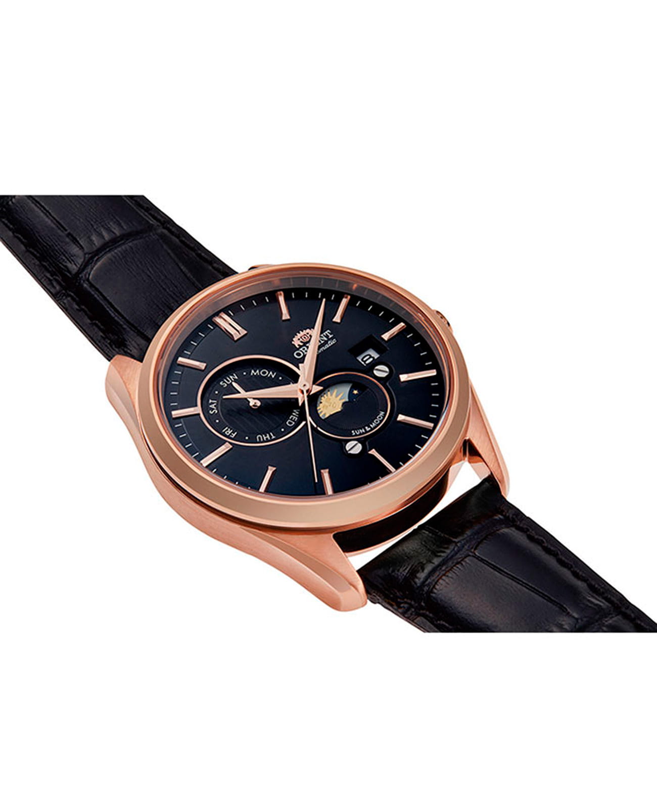 Циферблат выполнен в чёрном цвете с уникальным дизайном, включающим индикацию солнца и луны (Sun & Moon), что добавляет часам уникальный и стильный вид. На циферблате расположены римские цифры.