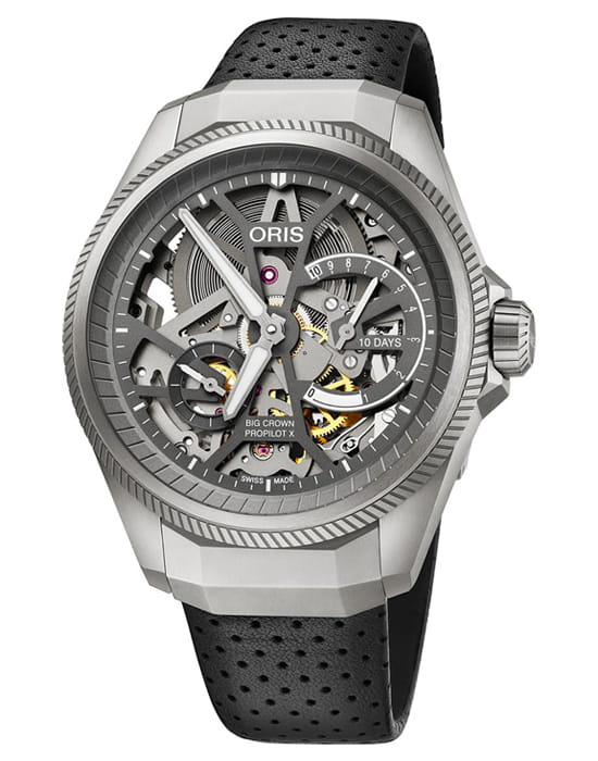 Откройте для себя ProPilot X Calibre 115, архитектурную красоту с титановым корпусом и браслетом, скелетонизированным циферблатом и 10-дневным запасом хода - характеристики, которые объединяет вечная радость независимого швейцарского механического часового дела. ProPilot X Calibre 115, шедевр современного часового искусства, в титановом корпусе 44 мм с черным кожаным ремнем. В них установлен завораживающий Calibre 115 - скелетонизированная версия 10-дневного калибра с ручным заводом, нелинейным индикатором запаса хода и малой секундной стрелкой.