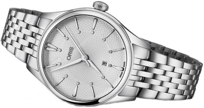 Oris 01 561 7724 4051-07 8 17 79 Artelier – это элегантные часы, сочетающие в себе классический дизайн и современную функциональность. Корпус из нержавеющей стали диаметром 33 мм идеально подходит для тех, кто ценит утонченность и стиль. Сапфировое стеклоСапфировое стеклоПрочный и надёжный материал из кристалла сапфира синтетического происхождения, характеризующийся особой твёрдостью и устойчивостью к царапинам и повреждениям. с антибликовым покрытием защищает циферблат от царапин и обеспечивает отличную читаемость при любом освещении. Стальной браслет на застёжке-бабочке с кнопкамиЗастёжка "бабочка"Такой вид застёжки дополняется предохранителями, помогающими избежать случайного раскрытия браслета. Обладают изящным исполнением. идеально дополняет дизайн часов, обеспечивая комфортное ношение. Часы оснащены центральной секундной стрелкой и окошком даты в положении «6 часов», что делает их функциональными для повседневного использования. Часы обладают водонепроницаемостью в 5 бар (50 метров). Каждая из этих функций прекрасно отображается на потрясающем циферблате, украшенном накладными индексами, гладкими стрелками из нержавеющей стали с бриллиантами, установленными в маркерах, и легендарным логотипом Oris.