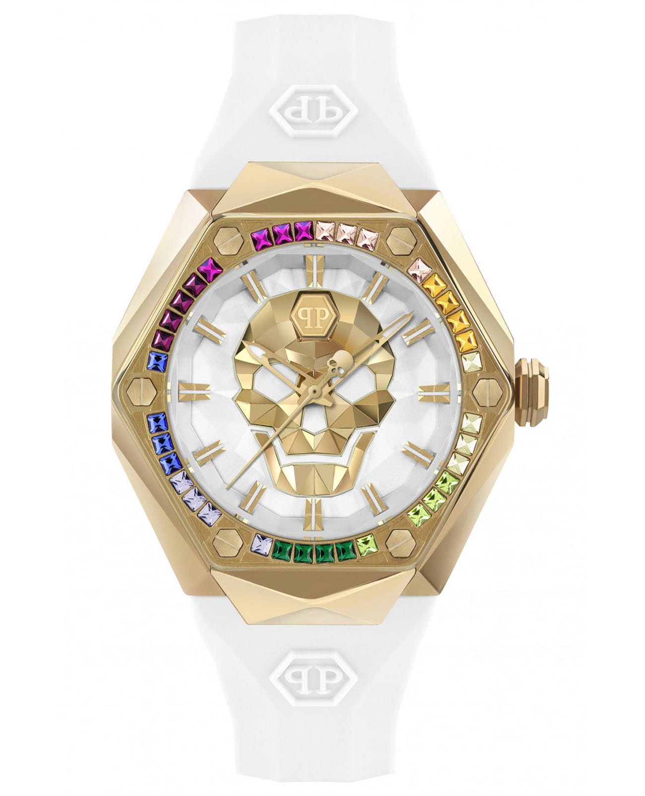 Стальной корпус с золотым IP-покрытиемIP-покрытиеМетод ионного напыления. Демонстрирует повышенную устойчивость к истиранию, окислению и химическим веществам. Под воздействием высокого давления и температуры около 1500°C молекулы металла надёжно соединяются с частицами корпуса часов.. БезельБезельВнешний ободок, закрепляющий стекло. В спортивных часах так называется поворотное кольцо с делениями на циферблате, выполняет роль таймера – замеряет отрезки времени на шкале. Неподвижный безель – элемент декора. Однонаправленно вращающийся безель на дайверских часах позволяет фиксировать моменты погружения и выныривания на поверхность. украшен шестиугольными логотипами бренда, расположенными симметрично слева и справа, сверху украшен символичным логотипом Philipp Plein, а снизу украшен названием коллекции ''The Skull''. Метки в виде штрихов.