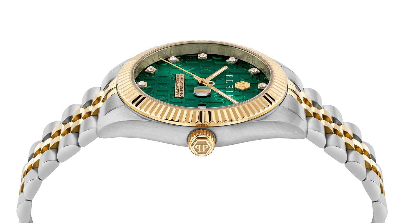 Philipp Plein Date Superlative Gent PWMFA0325 - это дерзкие и бескомпромиссные часы, воплощающие бунтарский дух бренда. Диаметр круглого корпуса из прочной нержавеющей стали равен 41 мм. Стальной браслет на застёжке «бабочка» с кнопкамиЗастёжка "бабочка"Такой вид застёжки дополняется предохранителями, помогающими избежать случайного раскрытия браслета. Обладают изящным исполнением. обеспечивает надёжную фиксацию и комфортное ношение. Метки в виде кристаллов Preciosa. Минеральное стеклоМинеральное стеклоМинеральное стекло представляет собой искусственно выращенный минерал кварца. Такое стекло отличается особой устойчивостью к повреждениям и царапинам. Уступает по некоторым качествам сапфировому стеклу. защищает циферблат от царапин. Люминесцентное покрытиеЛюминесцентное покрытиеПозволяет считывать показания времени в темноте. Производители наносят на стрелки, часовые индексы, безель или поверхность циферблата светонакопительный состав, дающий холодное свечение. стрелок и меток позволит следить за временем даже в полной темноте. БезельБезельВнешний ободок, закрепляющий стекло. В спортивных часах так называется поворотное кольцо с делениями на циферблате, выполняет роль таймера – замеряет отрезки времени на шкале. Неподвижный безель – элемент декора. Однонаправленно вращающийся безель на дайверских часах позволяет фиксировать моменты погружения и выныривания на поверхность. с PVD-покрытиемPVDУльтратонкое покрытие наносится в технике вакуумного напыления, сочетает в себе нитрид титана особой прочности со слоем золота или оксида хрома. Несёт в себе декоративную или защитную функцию.. Граненая заводная головка. Влагозащита: 50 метров, позволит защитить корпус от случайных брызг или капель дождя. Идеальный аксессуар для тех, кто ценит индивидуальность и не боится выделяться из толпы.