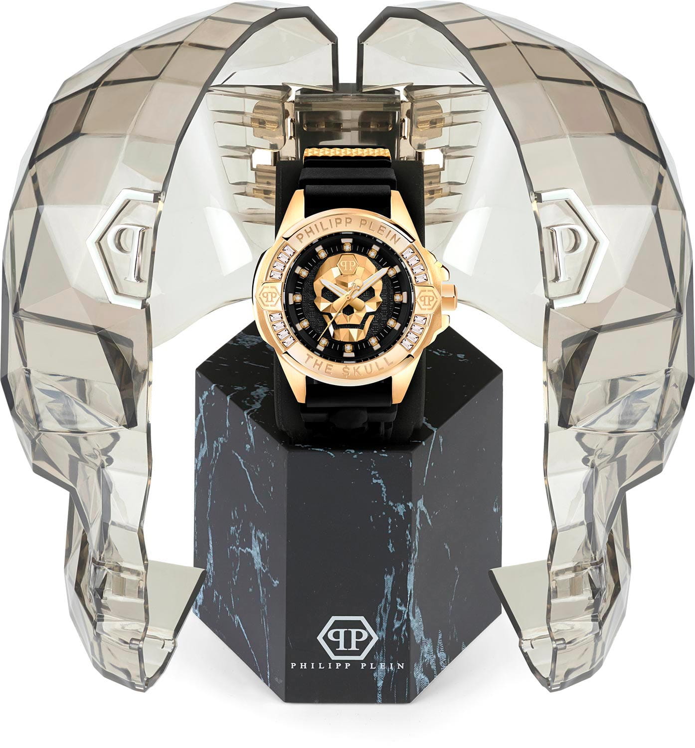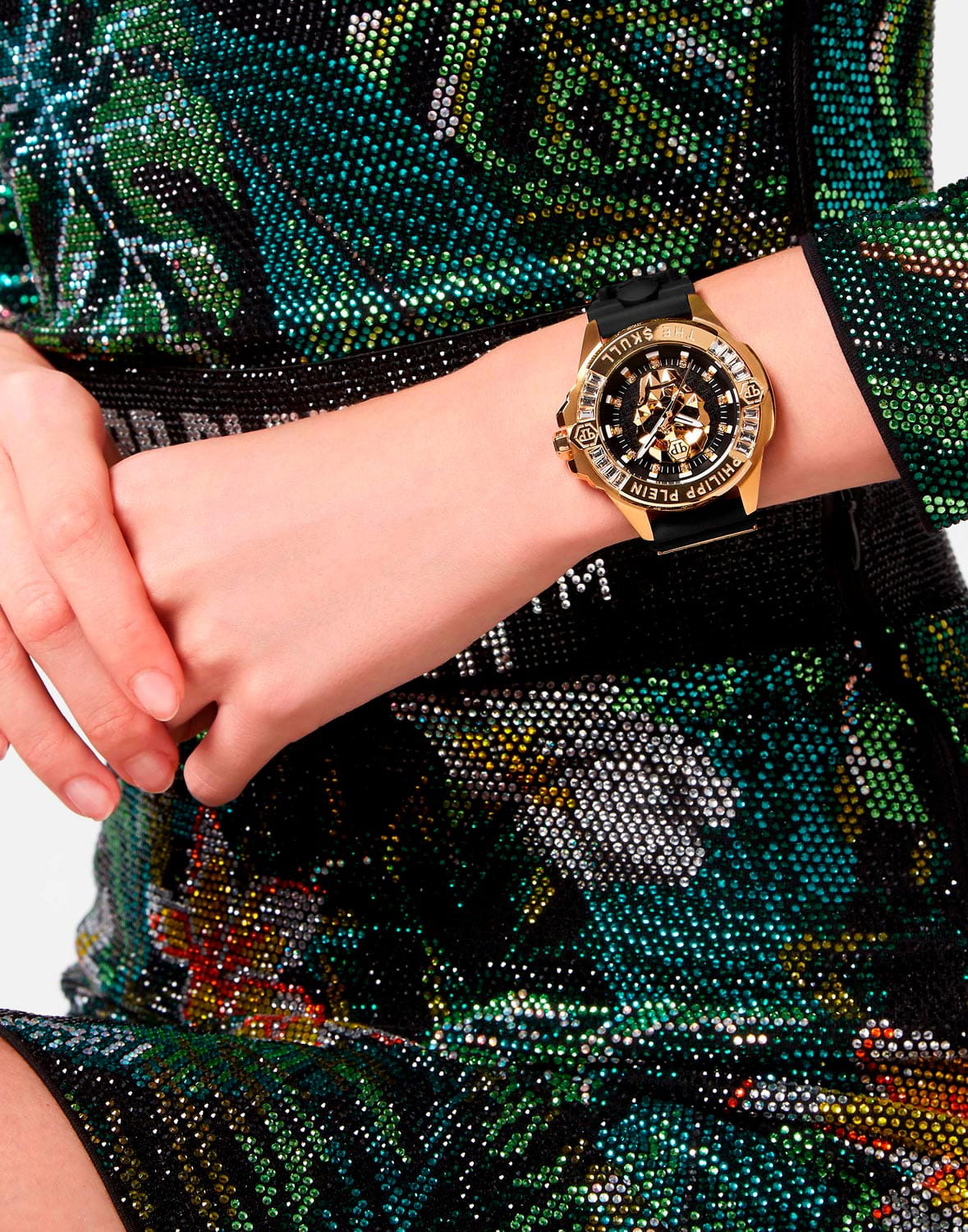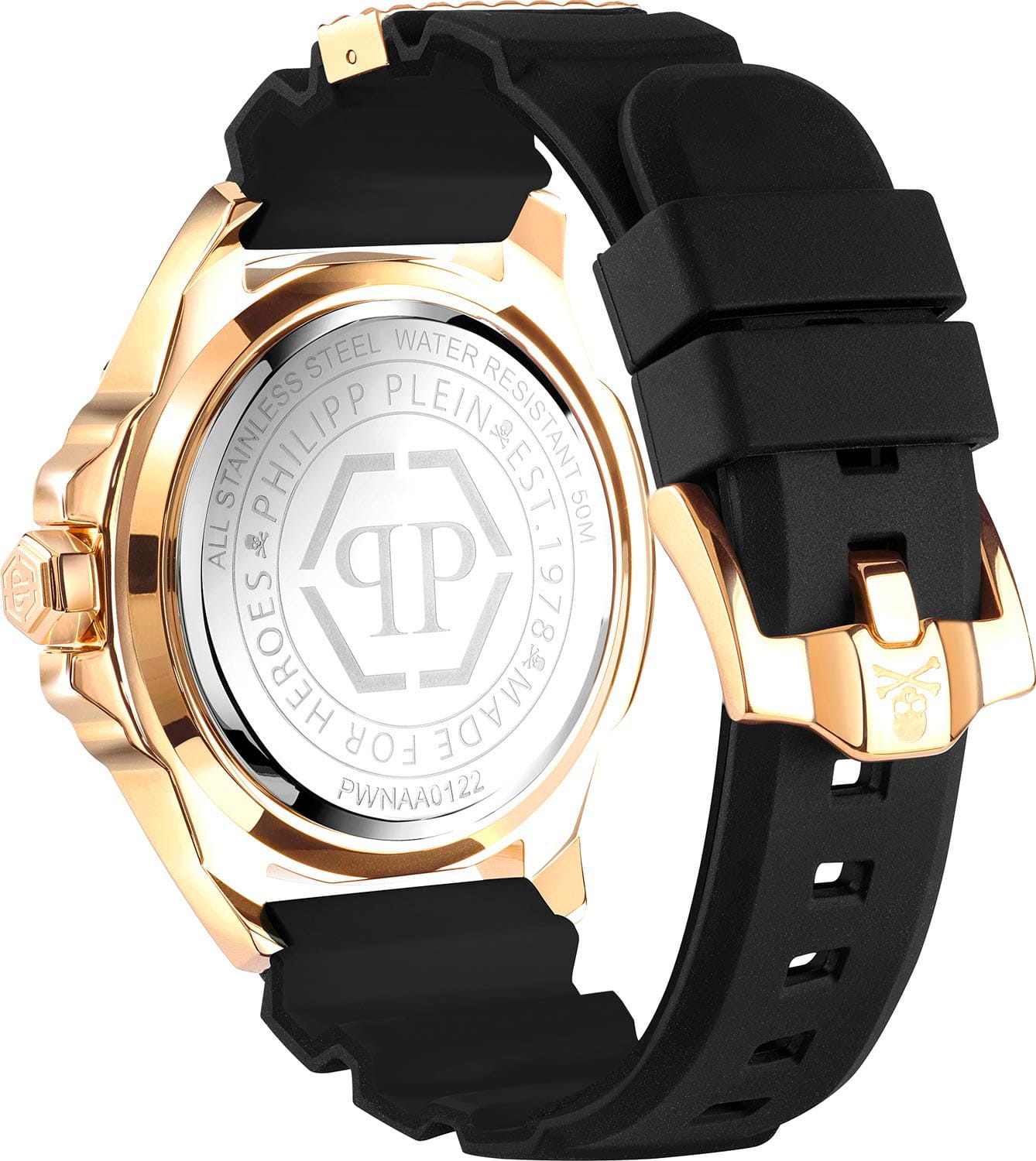 Яркие унисекс часы с минеральным стекломМинеральное стеклоМинеральное стекло представляет собой искусственно выращенный минерал кварца. Такое стекло отличается особой устойчивостью к повреждениям и царапинам. Уступает по некоторым качествам сапфировому стеклу. Philipp Plein The Skull PWNAA0122, кварцевый механизм с высокой точностью. Класс водозащиты: 50 метров, позволит защитить корпус от случайных брызг или капель дождя. Корпус часов изготовлен из стали с IP-покрытиемIP-покрытиеМетод ионного напыления. Демонстрирует повышенную устойчивость к истиранию, окислению и химическим веществам. Под воздействием высокого давления и температуры около 1500°C молекулы металла надёжно соединяются с частицами корпуса часов.. Круглый стальной корпус украшен кристаллами Swarovski. Циферблат с метками в виде точек украшенных кристаллами Swarovski, дополнен трехмерным граненым черепом. Шестигранная заводная головка с защитой. Силиконовый ремешок украшен объемным черепом и стальной вставкой.