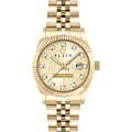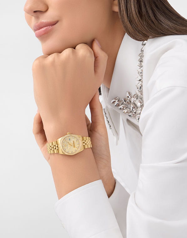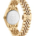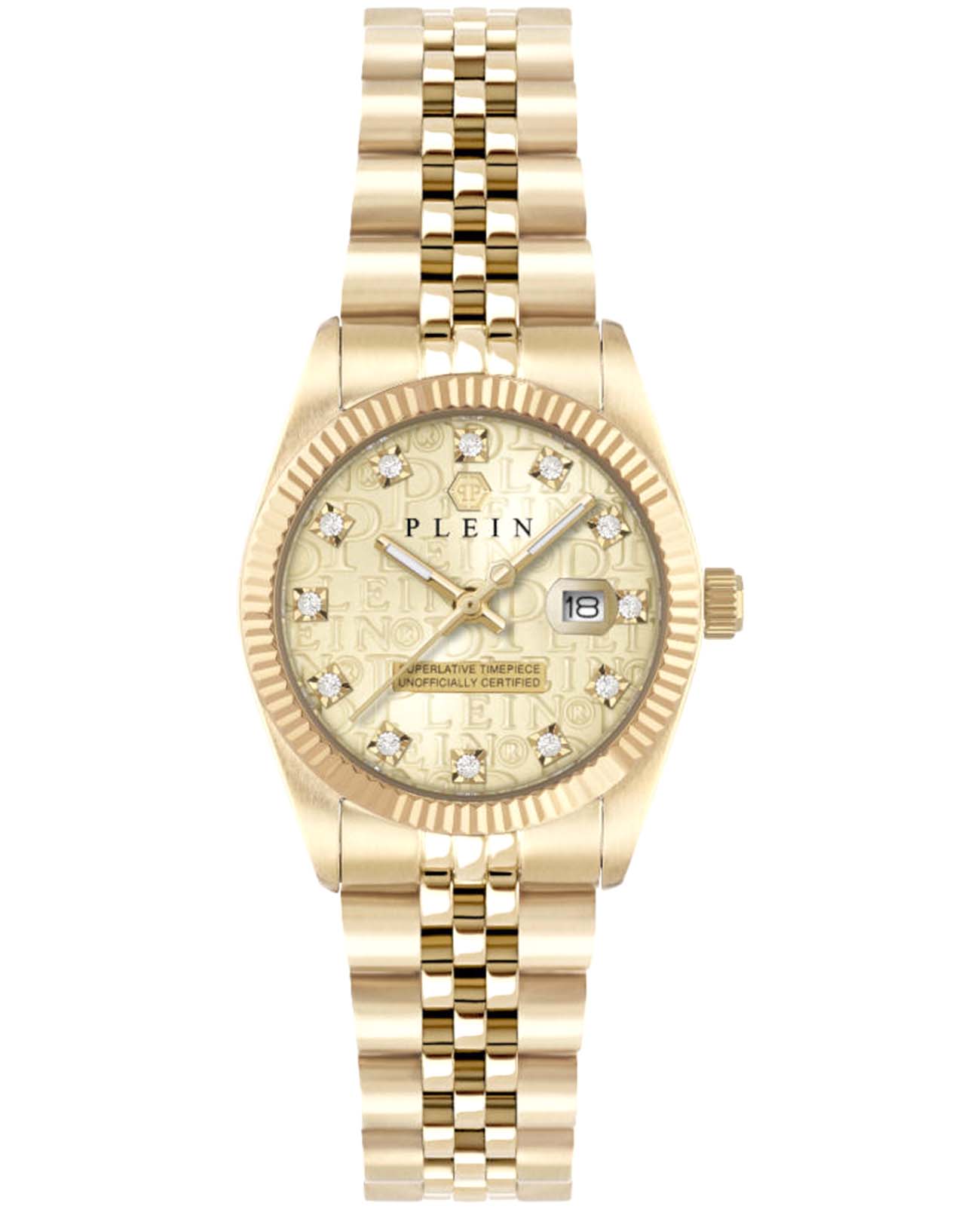 Philipp Plein DATE SUPERLATIVE PWNFA0525 - дерзкое заявление любви к роскоши и бунтарскому стилю. Диаметр круглого корпуса из прочной нержавеющей стали с PVD-покрытиемPVDУльтратонкое покрытие наносится в технике вакуумного напыления, сочетает в себе нитрид титана особой прочности со слоем золота или оксида хрома. Несёт в себе декоративную или защитную функцию. равен 28 мм. Стальной браслет на застёжке «бабочка» с кнопкамиЗастёжка "бабочка"Такой вид застёжки дополняется предохранителями, помогающими избежать случайного раскрытия браслета. Обладают изящным исполнением. обеспечивает надёжную фиксацию и комфортное ношение. Метки в виде кристаллов Preciosa. Минеральное стеклоМинеральное стеклоМинеральное стекло представляет собой искусственно выращенный минерал кварца. Такое стекло отличается особой устойчивостью к повреждениям и царапинам. Уступает по некоторым качествам сапфировому стеклу. защищает циферблат от царапин. Люминесцентное покрытиеЛюминесцентное покрытиеПозволяет считывать показания времени в темноте. Производители наносят на стрелки, часовые индексы, безель или поверхность циферблата светонакопительный состав, дающий холодное свечение. стрелок и меток позволит следить за временем даже в полной темноте. Граненая заводная головка. Влагозащита: 50 метров, позволит защитить корпус от случайных брызг или капель дождя. Идеальный аксессуар для тех, кто ценит индивидуальность и не боится выделяться из толпы.
