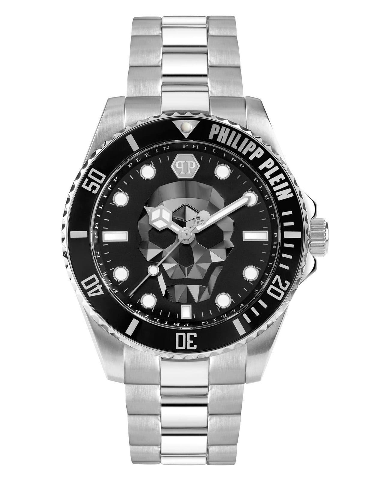 Яркие мужские часы с минеральным стекломМинеральное стеклоМинеральное стекло представляет собой искусственно выращенный минерал кварца. Такое стекло отличается особой устойчивостью к повреждениям и царапинам. Уступает по некоторым качествам сапфировому стеклу. Philipp Plein The Skull PWOAA0522, кварцевый механизм с высокой точностью. Класс водозащиты: 50 метров, позволит защитить корпус от случайных брызг или капель дождя. Корпус часов изготовлен из стали. Циферблат с метками в виде штрихов и точек украшен трехмерным граненым черепом и логотипом. Шестигранная заводная головка с защитой. Застёжка бабочка с кнопкамиЗастёжка "бабочка"Такой вид застёжки дополняется предохранителями, помогающими избежать случайного раскрытия браслета. Обладают изящным исполнением. .