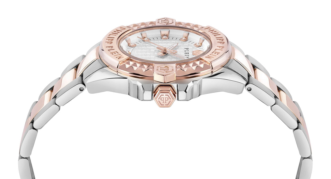 Philipp Plein Plein Majesty PWOFA0525 - дерзкое заявление любви к роскоши и бунтарскому стилю. Диаметр круглого корпуса из прочной нержавеющей стали равен 38 мм. Стальной браслет на застёжке-бабочке с кнопкамиЗастёжка "бабочка"Такой вид застёжки дополняется предохранителями, помогающими избежать случайного раскрытия браслета. Обладают изящным исполнением. обеспечивает надёжную фиксацию и комфортное ношение. Метки в виде кристаллов Preciosa. Минеральное стеклоМинеральное стеклоМинеральное стекло представляет собой искусственно выращенный минерал кварца. Такое стекло отличается особой устойчивостью к повреждениям и царапинам. Уступает по некоторым качествам сапфировому стеклу. защищает циферблат от царапин. Люминесцентное покрытиеЛюминесцентное покрытиеПозволяет считывать показания времени в темноте. Производители наносят на стрелки, часовые индексы, безель или поверхность циферблата светонакопительный состав, дающий холодное свечение. стрелок и меток позволит следить за временем даже в полной темноте. Неподвижный безельБезельВнешний ободок, закрепляющий стекло. В спортивных часах так называется поворотное кольцо с делениями на циферблате, выполняет роль таймера – замеряет отрезки времени на шкале. Неподвижный безель – элемент декора. Однонаправленно вращающийся безель на дайверских часах позволяет фиксировать моменты погружения и выныривания на поверхность. с PVD-покрытиемPVDУльтратонкое покрытие наносится в технике вакуумного напыления, сочетает в себе нитрид титана особой прочности со слоем золота или оксида хрома. Несёт в себе декоративную или защитную функцию.. Влагозащита: 50 метров, позволит защитить корпус от случайных брызг или капель дождя. Идеальный аксессуар для тех, кто ценит индивидуальность и не боится выделяться из толпы.