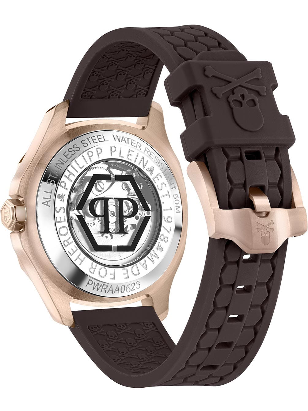 Яркие мужские часы с минеральным стекломМинеральное стеклоМинеральное стекло представляет собой искусственно выращенный минерал кварца. Такое стекло отличается особой устойчивостью к повреждениям и царапинам. Уступает по некоторым качествам сапфировому стеклу. Philipp Plein PWRAA0623, механический механизм. Класс водозащиты: 50 метров, позволит защитить корпус от случайных брызг или капель дождя. Корпус часов изготовлен из стали и украшен кристаллами. Стрелки и метки с люминесцентным покрытиемЛюминесцентное покрытиеПозволяет считывать показания времени в темноте. Производители наносят на стрелки, часовые индексы, безель или поверхность циферблата светонакопительный состав, дающий холодное свечение.. Скелетонизированные. Часы с механизмом, из которого удалён весь «лишний» металл, с прозрачными циферблатом и задней крышкой,