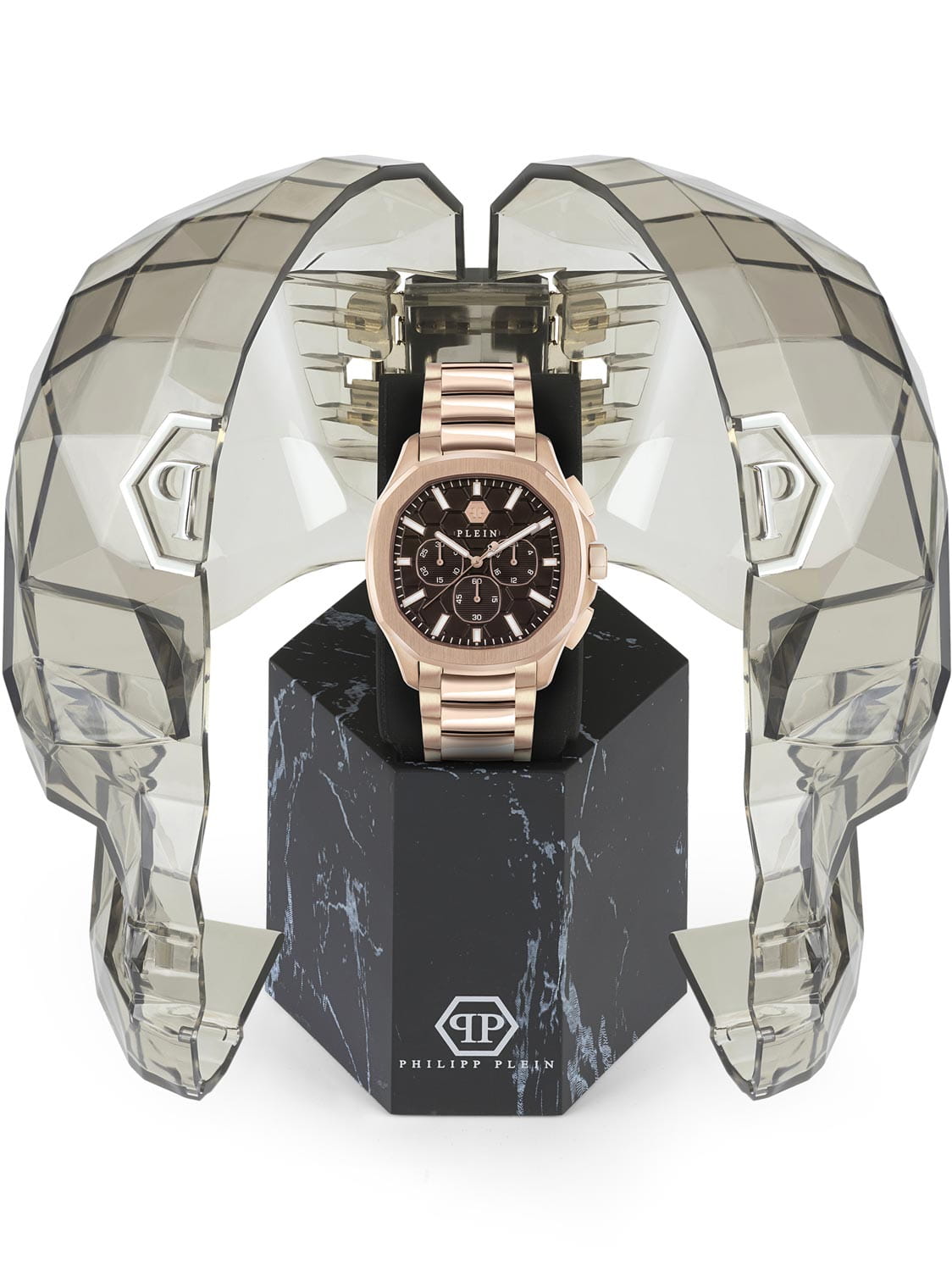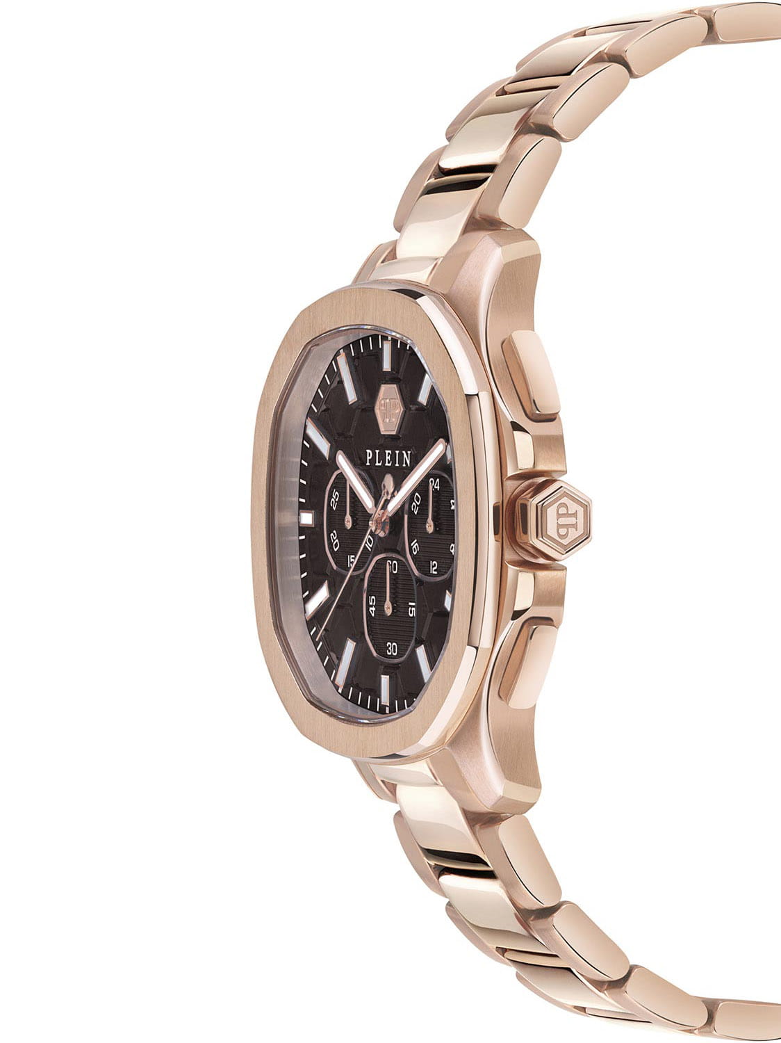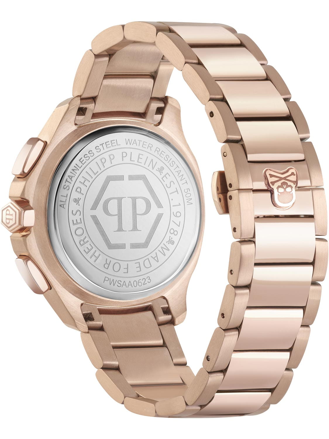 Яркие мужские часы-хронографХронографФункция позволяет измерять отрезки времени с особой точностью: часы, минуты, секунды. Верным признаком хронографа является наличие на циферблате 3 дополнительных окошек-счётчиков. с секундомеромСекундомерСекундоме́р — прибор, способный измерять интервалы времени с точностью до долей секунды. Philipp Plein PWSAA0623, кварцевый механизм с высокой точностью. Класс водозащиты: 50 метров, позволит защитить корпус от случайных брызг или капель дождя. Корпус часов изготовлен из стали с IP-покрытиемIP-покрытиеМетод ионного напыления. Демонстрирует повышенную устойчивость к истиранию, окислению и химическим веществам. Под воздействием высокого давления и температуры около 1500°C молекулы металла надёжно соединяются с частицами корпуса часов.. Стрелки и метки с люминесцентным покрытиемЛюминесцентное покрытиеПозволяет считывать показания времени в темноте. Производители наносят на стрелки, часовые индексы, безель или поверхность циферблата светонакопительный состав, дающий холодное свечение.. Застёжка бабочка с кнопкамиЗастёжка "бабочка"Такой вид застёжки дополняется предохранителями, помогающими избежать случайного раскрытия браслета. Обладают изящным исполнением.