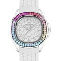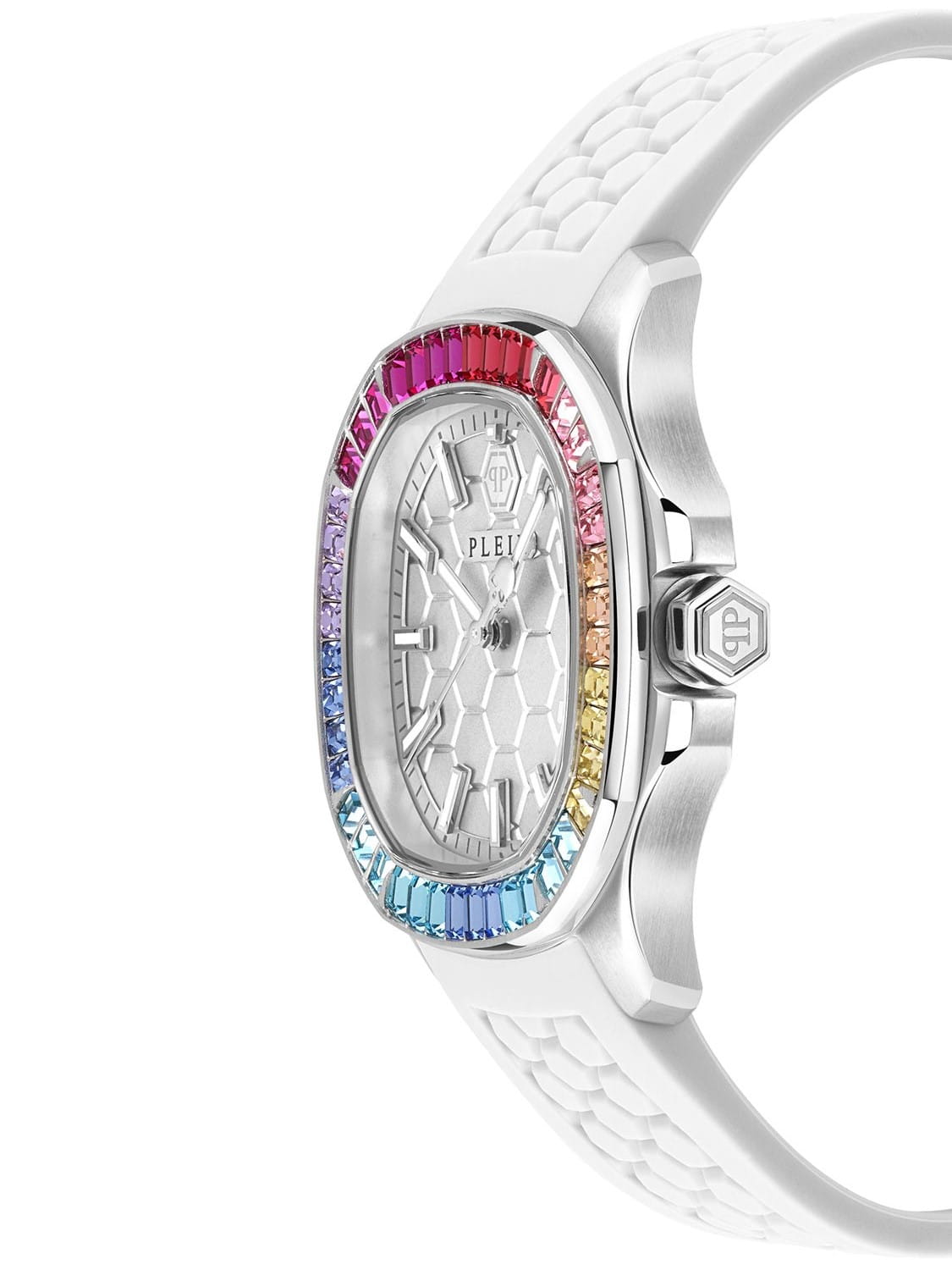 Яркие женские часы с минеральным стекломМинеральное стеклоМинеральное стекло представляет собой искусственно выращенный минерал кварца. Такое стекло отличается особой устойчивостью к повреждениям и царапинам. Уступает по некоторым качествам сапфировому стеклу. Philipp Plein PWTAA0223, кварцевый механизм с высокой точностью. Класс водозащиты: 50 метров, позволит защитить корпус от случайных брызг или капель дождя. Корпус часов изготовлен из стали с IP-покрытиемIP-покрытиеМетод ионного напыления. Демонстрирует повышенную устойчивость к истиранию, окислению и химическим веществам. Под воздействием высокого давления и температуры около 1500°C молекулы металла надёжно соединяются с частицами корпуса часов.. Стрелки и метки с люминесцентным покрытиемЛюминесцентное покрытиеПозволяет считывать показания времени в темноте. Производители наносят на стрелки, часовые индексы, безель или поверхность циферблата светонакопительный состав, дающий холодное свечение.. Стальной корпус с геометричным безелем, инкрустированным кристаллами.