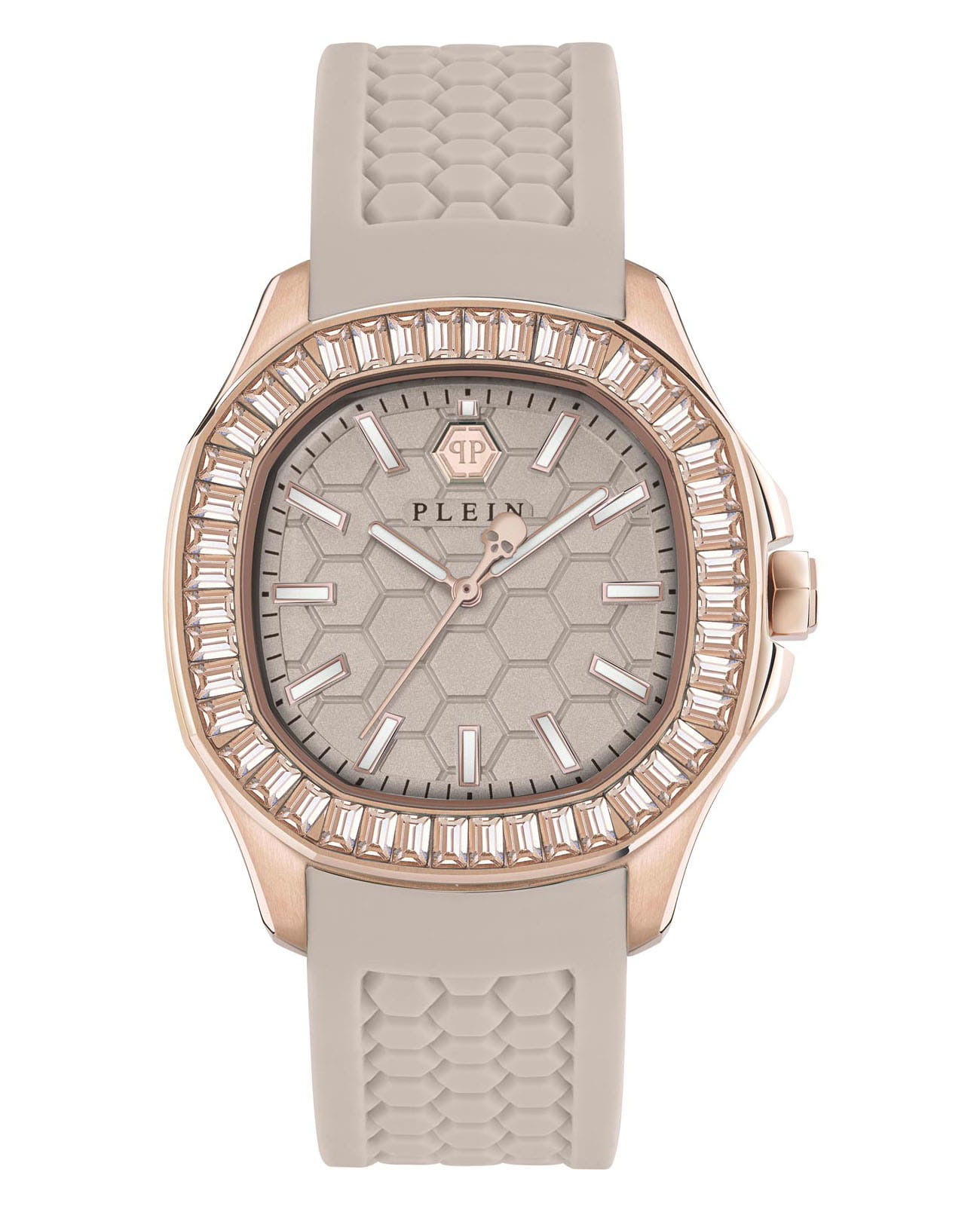 Яркие женские часы с минеральным стекломМинеральное стеклоМинеральное стекло представляет собой искусственно выращенный минерал кварца. Такое стекло отличается особой устойчивостью к повреждениям и царапинам. Уступает по некоторым качествам сапфировому стеклу. Philipp Plein PWTAA0423, кварцевый механизм с высокой точностью. Класс водозащиты: 50 метров, позволит защитить корпус от случайных брызг или капель дождя. Корпус часов изготовлен из стали с IP-покрытиемIP-покрытиеМетод ионного напыления. Демонстрирует повышенную устойчивость к истиранию, окислению и химическим веществам. Под воздействием высокого давления и температуры около 1500°C молекулы металла надёжно соединяются с частицами корпуса часов.. Стрелки и метки с люминесцентным покрытиемЛюминесцентное покрытиеПозволяет считывать показания времени в темноте. Производители наносят на стрелки, часовые индексы, безель или поверхность циферблата светонакопительный состав, дающий холодное свечение.. Стальной корпус с геометричным безелем, инкрустированным кристаллами.