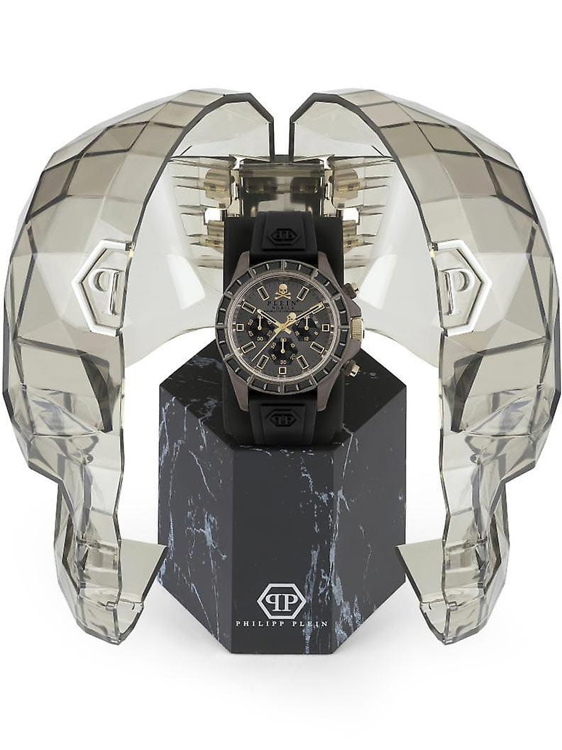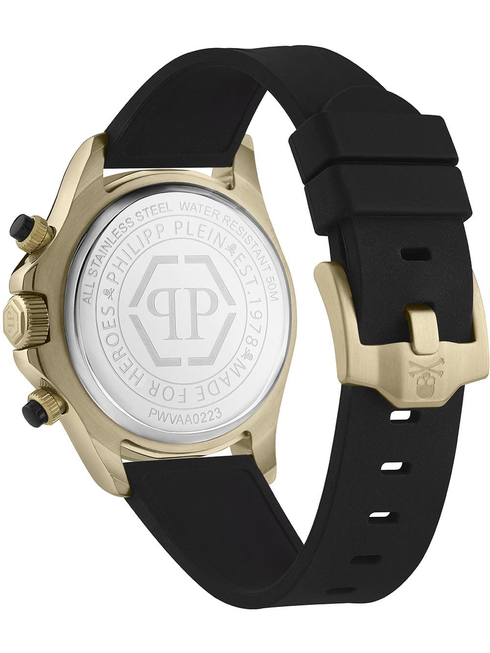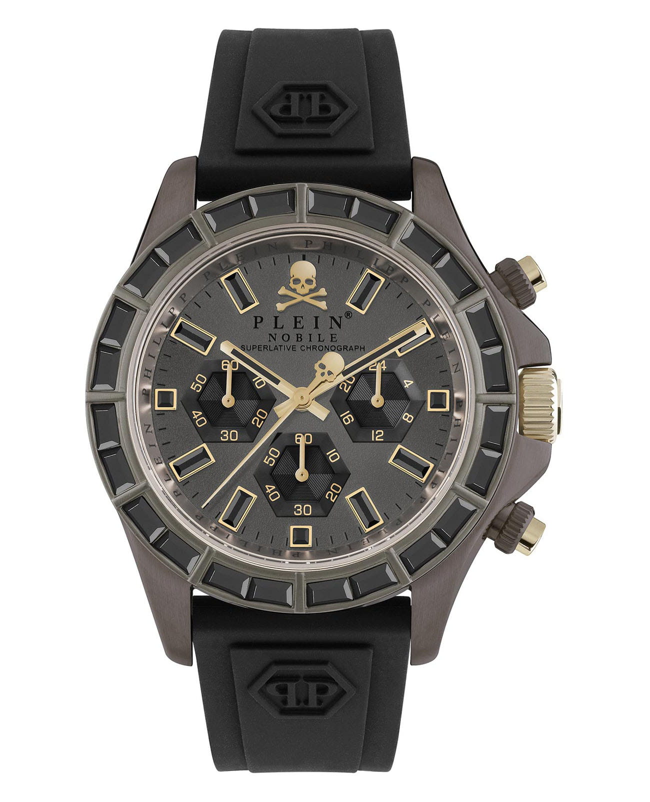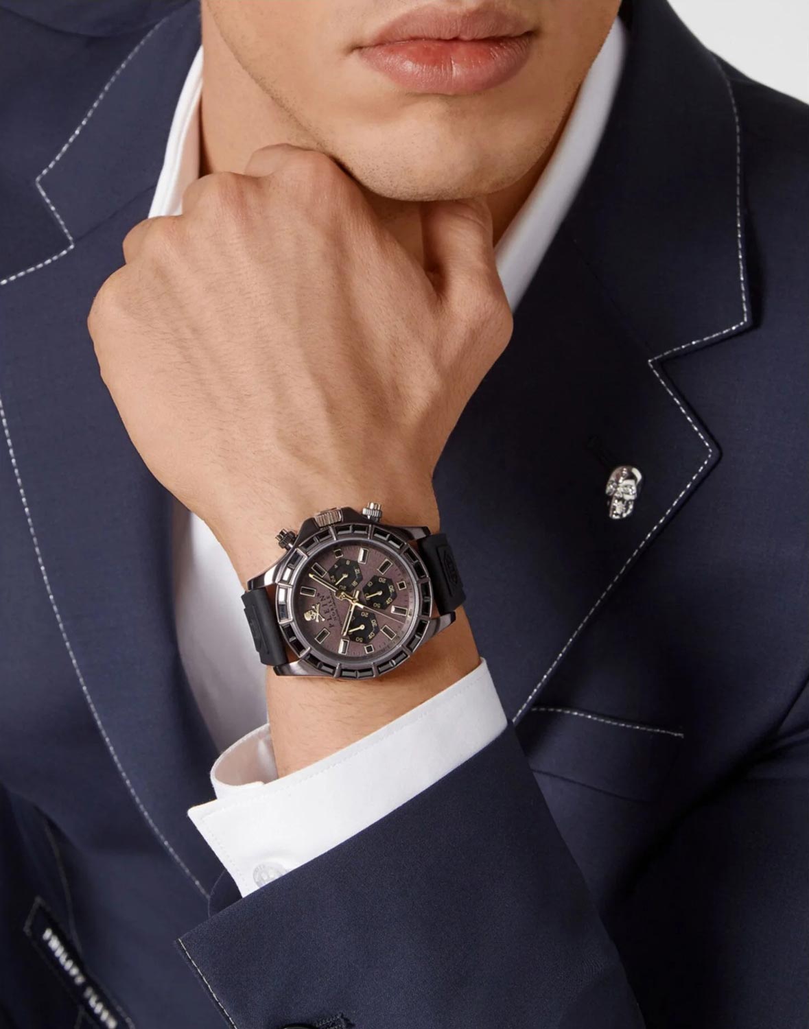 Яркие мужские часы-хронографХронографФункция позволяет измерять отрезки времени с особой точностью: часы, минуты, секунды. Верным признаком хронографа является наличие на циферблате 3 дополнительных окошек-счётчиков. Philipp Plein Nobile Racing PWVAA0323 с секундомеромСекундомерСекундоме́р — прибор, способный измерять интервалы времени с точностью до долей секунды., кварцевый механизм с высокой точностью. Класс водозащиты: 50 метров, позволит защитить корпус от случайных брызг или капель дождя. Корпус часов изготовлен из стали с IP-покрытиемIP-покрытиеМетод ионного напыления. Демонстрирует повышенную устойчивость к истиранию, окислению и химическим веществам. Под воздействием высокого давления и температуры около 1500°C молекулы металла надёжно соединяются с частицами корпуса часов., циферблат украшен кристаллами, защищен прочным минеральным стекломМинеральное стеклоМинеральное стекло представляет собой искусственно выращенный минерал кварца. Такое стекло отличается особой устойчивостью к повреждениям и царапинам. Уступает по некоторым качествам сапфировому стеклу..