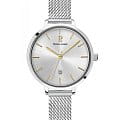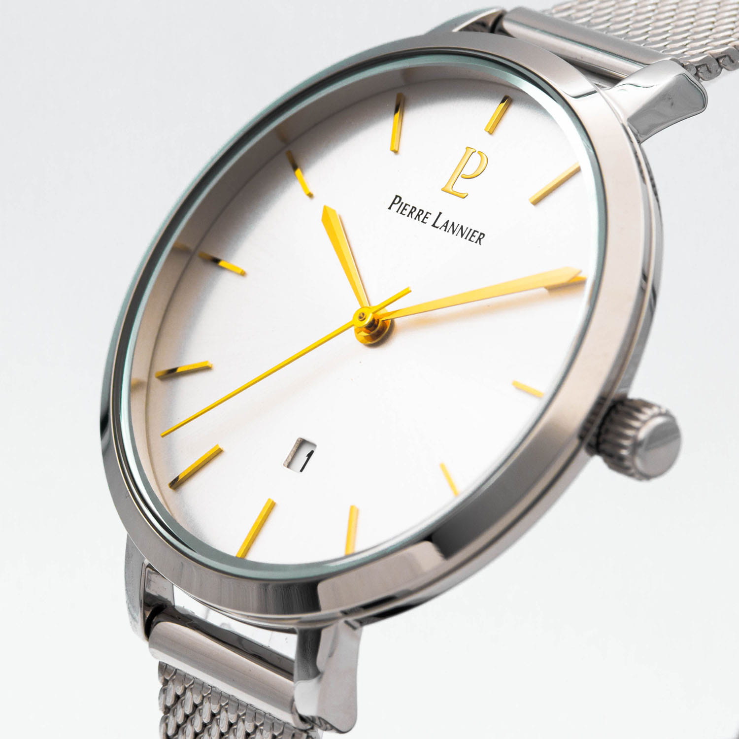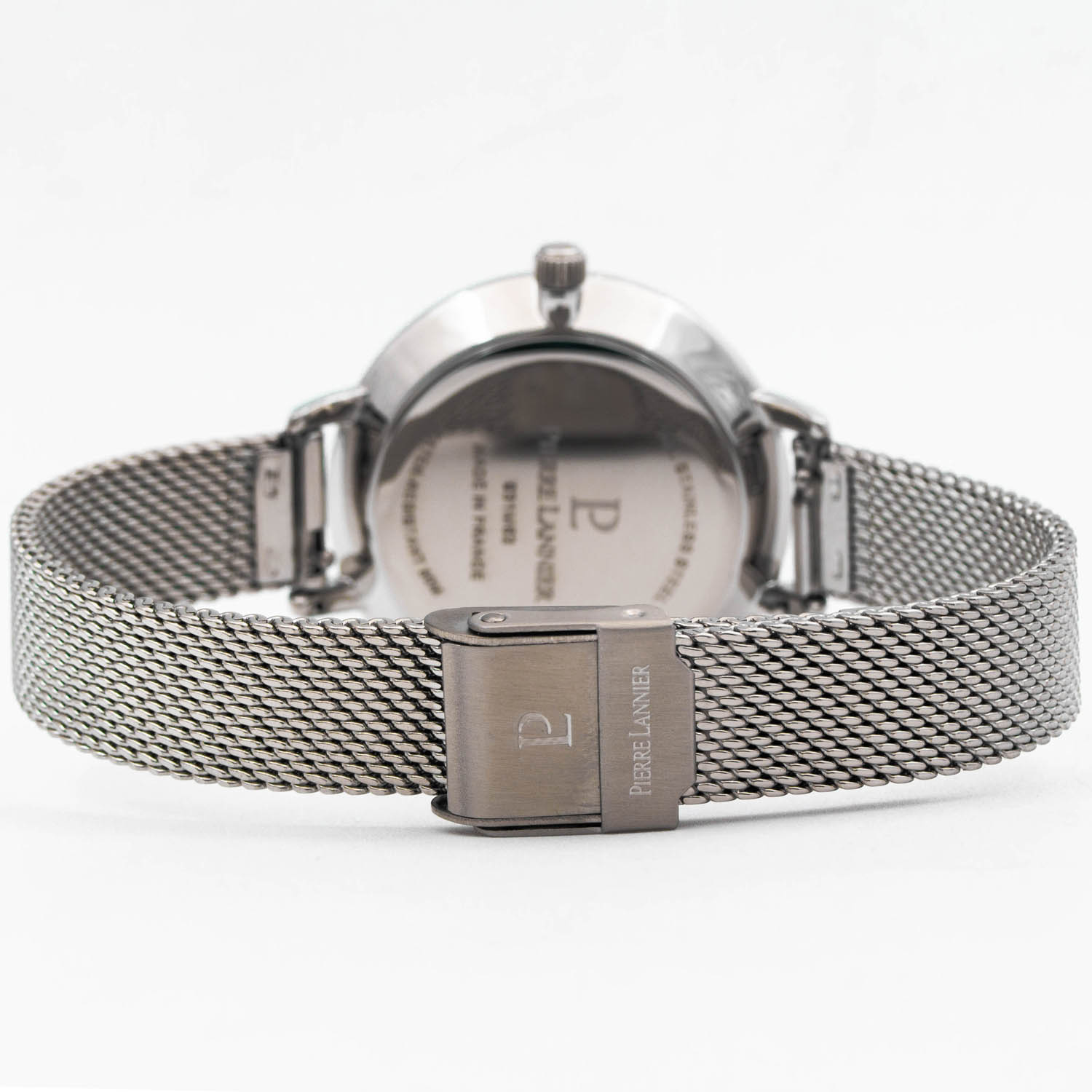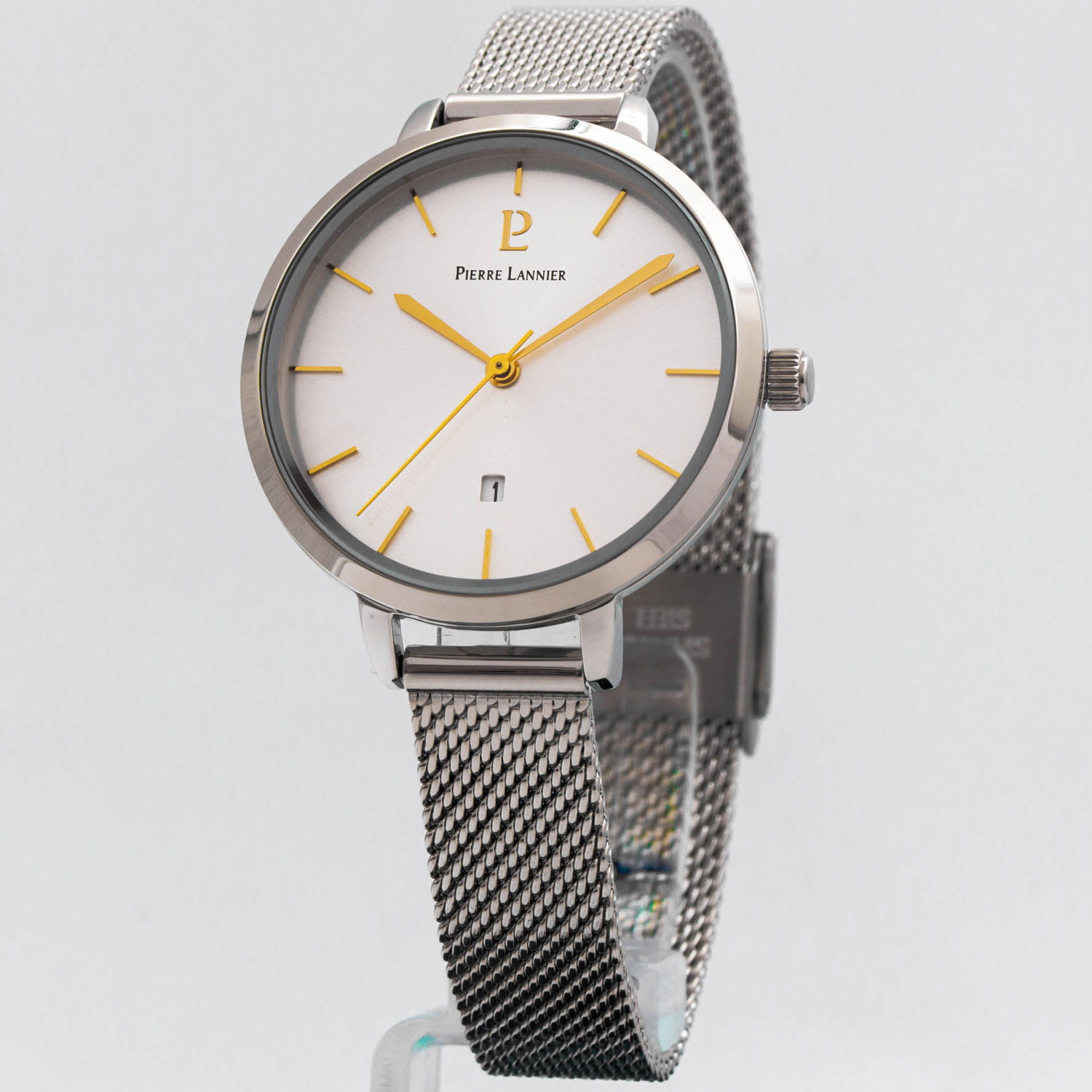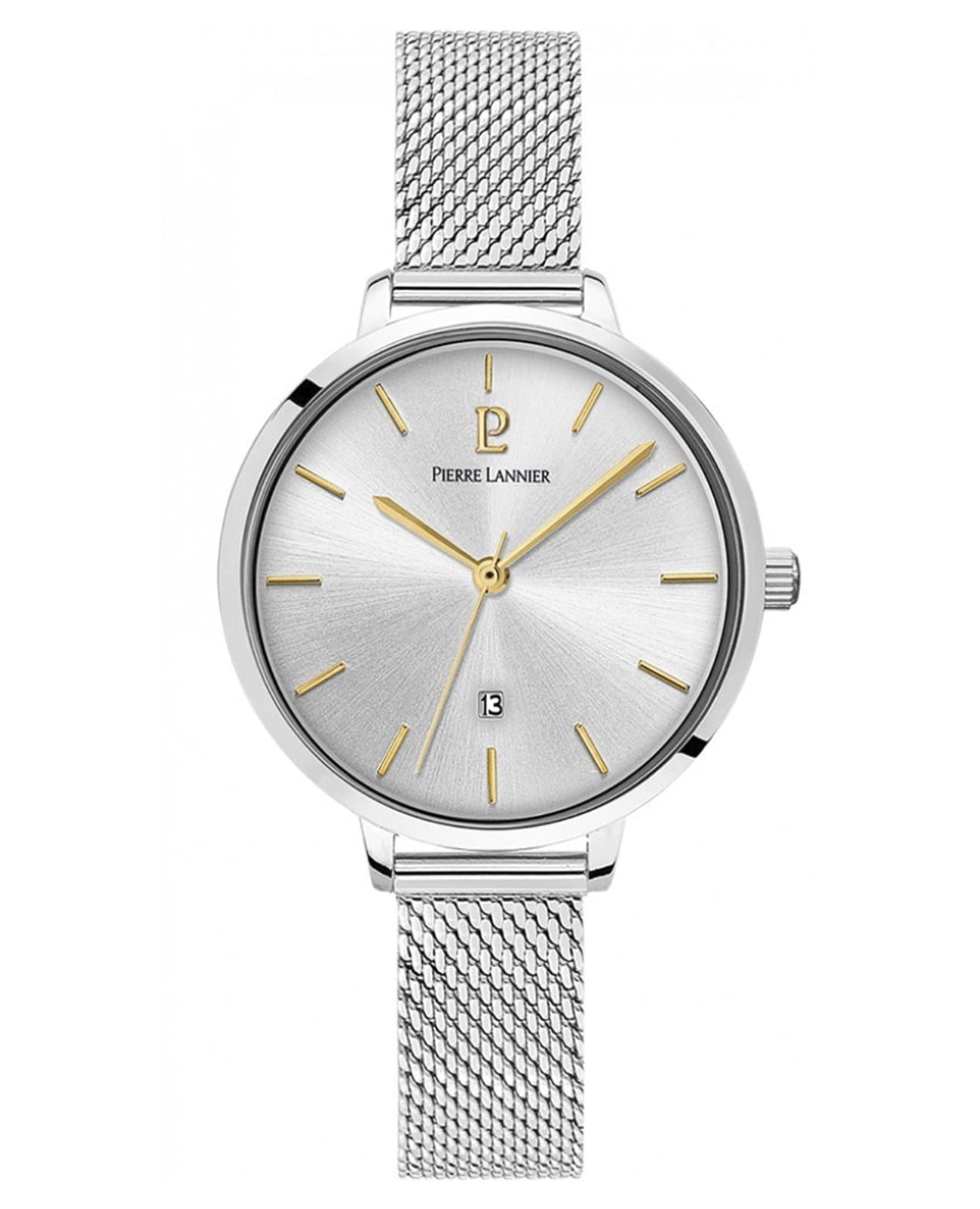 Женские кварцевые часы Pierre Lannier Echo 031M621. Центральные часовая и минутная стрелки. Серебристый циферблат с часовыми индексами в виде штрихов.Окошко даты в позиции 6 часов. Круглый корпус выполнен из полированной нержавеющей стали. Стальной браслет выполнен в технике миланского плетения, раскладная застёжкаРаскладная застёжкаТакой тип застёжки используется только на браслетах из металла. Она никогда не раскрывается полностью, происходит разделение на 2 и более частей. Раскладывающая застёжка снизит вероятность потери часов к минимуму.. Прочное минеральное стеклоМинеральное стеклоМинеральное стекло представляет собой искусственно выращенный минерал кварца. Такое стекло отличается особой устойчивостью к повреждениям и царапинам. Уступает по некоторым качествам сапфировому стеклу., устойчивое к мелким механическим повреждениям. Водостойкость: 50 метров, позволит защитить корпус от случайных брызг или капель дождя.