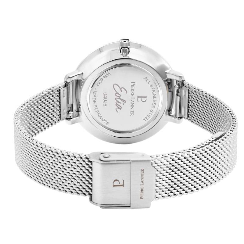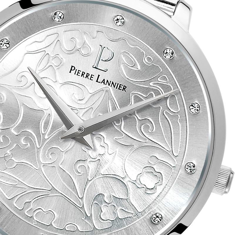 Женские кварцевые часы Pierre Lannier Eolia 040J628. Минеральное стеклоМинеральное стеклоМинеральное стекло представляет собой искусственно выращенный минерал кварца. Такое стекло отличается особой устойчивостью к повреждениям и царапинам. Уступает по некоторым качествам сапфировому стеклу. устойчивое к мелким механическим повреждениям. Центральные часовая и минутная стрелки. Корпус выполнен из нержавеющей стали. Водостойкость: 50 метров, позволит защитить корпус от случайных брызг или капель дождя. Стальной браслет миланского плетения с раскладной застёжкойРаскладная застёжкаТакой тип застёжки используется только на браслетах из металла. Она никогда не раскрывается полностью, происходит разделение на 2 и более частей. Раскладывающая застёжка снизит вероятность потери часов к минимуму.. Серебристый циферблат украшен кристаллами.