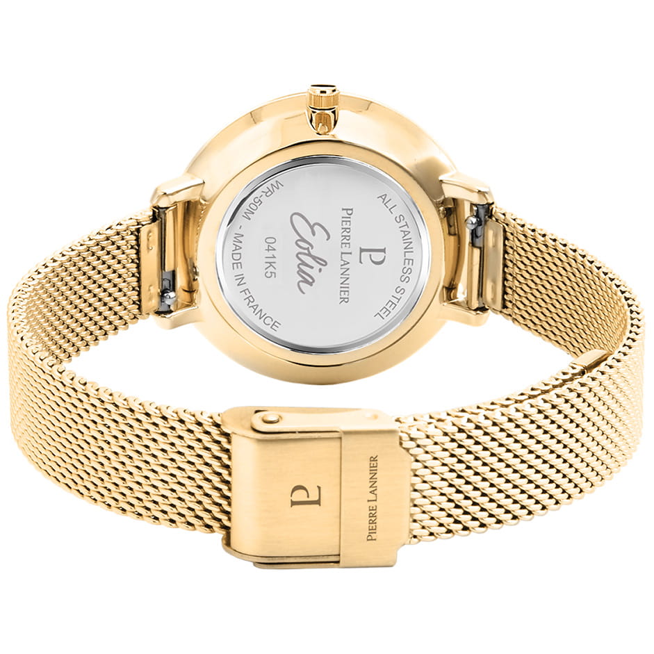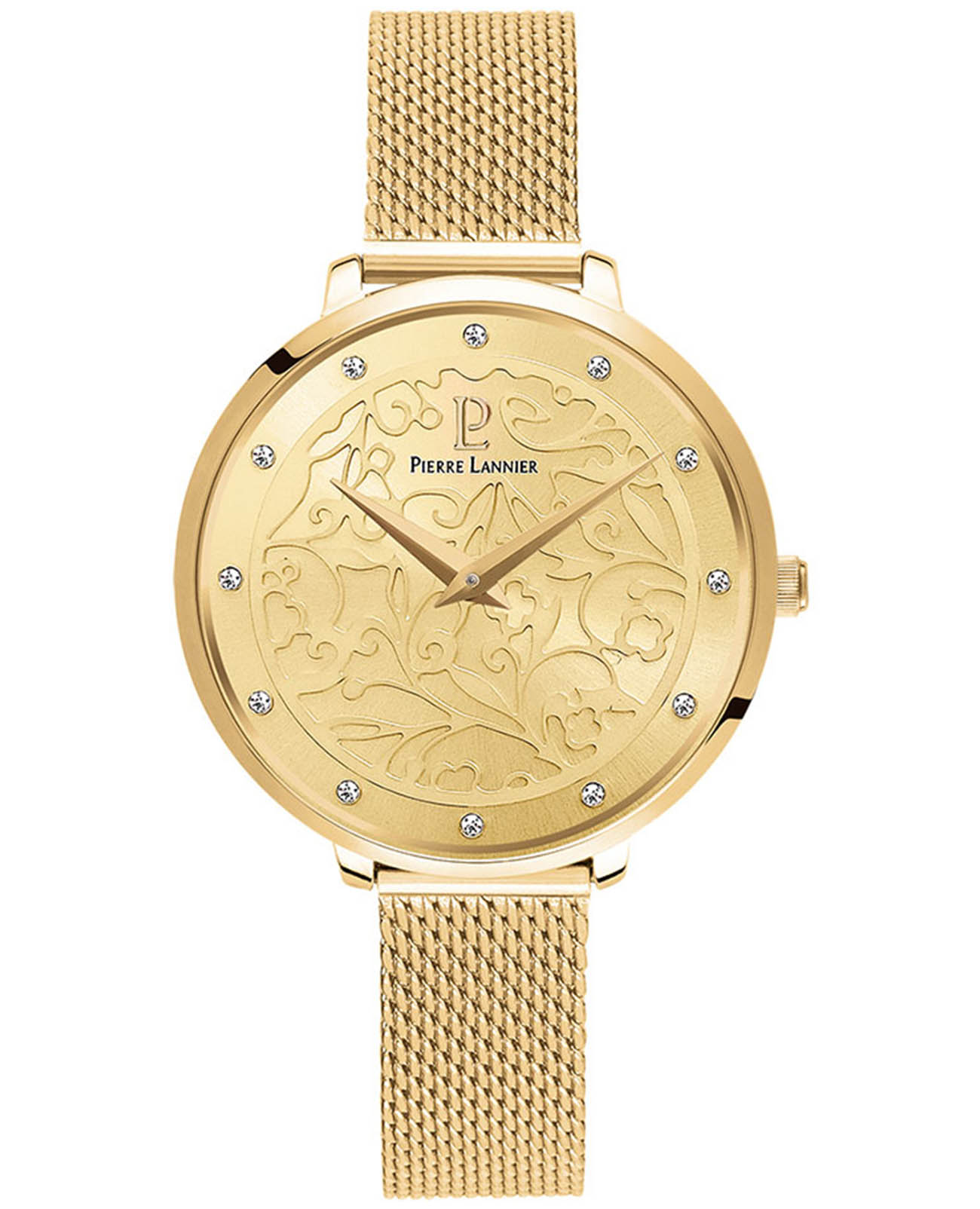 Женские кварцевые часы Pierre Lannier Eolia 041K548. Минеральное стеклоМинеральное стеклоМинеральное стекло представляет собой искусственно выращенный минерал кварца. Такое стекло отличается особой устойчивостью к повреждениям и царапинам. Уступает по некоторым качествам сапфировому стеклу. устойчивое к мелким механическим повреждениям. Центральные часовая и минутная стрелки. Золотистый циферблат украшен кристаллами. Круглый корпус выполнен из нержавеющей стали с IP-покрытиемIP-покрытиеМетод ионного напыления. Демонстрирует повышенную устойчивость к истиранию, окислению и химическим веществам. Под воздействием высокого давления и температуры около 1500°C молекулы металла надёжно соединяются с частицами корпуса часов. цвета желтого золота. Диаметр корпуса 33 мм. Стальной браслет с покрытием выполнен в технике миланского плетения, раскладная застёжкаРаскладная застёжкаТакой тип застёжки используется только на браслетах из металла. Она никогда не раскрывается полностью, происходит разделение на 2 и более частей. Раскладывающая застёжка снизит вероятность потери часов к минимуму.. Водозащита WR 50.
