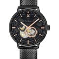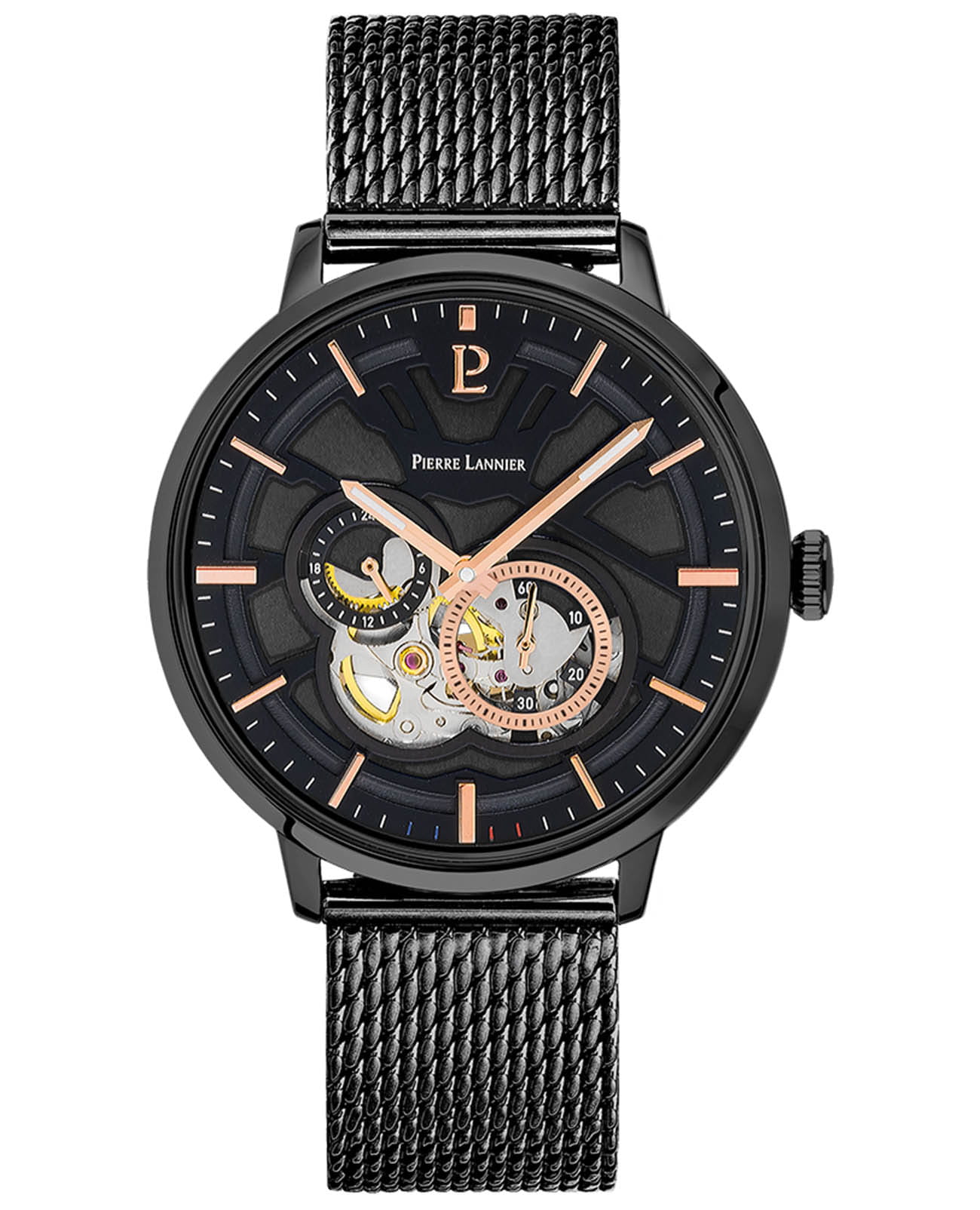 Мужские механические часы с автоподзаводом Pierre Lannier Trio 379D439. Минеральное стеклоМинеральное стеклоМинеральное стекло представляет собой искусственно выращенный минерал кварца. Такое стекло отличается особой устойчивостью к повреждениям и царапинам. Уступает по некоторым качествам сапфировому стеклу. устойчивое к мелким механическим повреждениям. 12/24х часовой формат времени. Центральные часовая и минутная стрелки, секундная стрелка вынесена на малый циферблат. Корпус выполнен из нержавеющей стали с IP-покрытиемIP-покрытиеМетод ионного напыления. Демонстрирует повышенную устойчивость к истиранию, окислению и химическим веществам. Под воздействием высокого давления и температуры около 1500°C молекулы металла надёжно соединяются с частицами корпуса часов.. Водостойкость: 50 метров, позволит защитить корпус от случайных брызг или капель дождя. Стальной браслет миланского плетения с раскладной застёжкойРаскладная застёжкаТакой тип застёжки используется только на браслетах из металла. Она никогда не раскрывается полностью, происходит разделение на 2 и более частей. Раскладывающая застёжка снизит вероятность потери часов к минимуму.. Черный циферблат с открытым балансом хода. В комплекте кожаный ремешок. Стрелки с люминесцентным покрытиемЛюминесцентное покрытиеПозволяет считывать показания времени в темноте. Производители наносят на стрелки, часовые индексы, безель или поверхность циферблата светонакопительный состав, дающий холодное свечение..