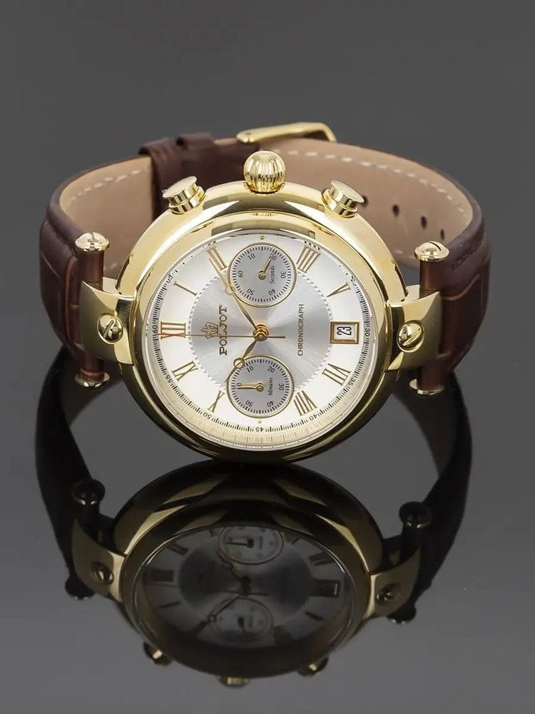 Poljot 6S21.966054 “Baikal” — элегантные кварцевые мужские часы, в которых классическая строгость сочетается с выразительным российским характером. Корпус из нержавеющей стали с PVD-покрытиемPVDУльтратонкое покрытие наносится в технике вакуумного напыления, сочетает в себе нитрид титана особой прочности со слоем золота или оксида хрома. Несёт в себе декоративную или защитную функцию. с крупными декоративными ушками придаёт модели солидность и узнаваемость, а глубокий циферблат с контрастными стрелками и индексами подчёркивает точность и функциональность. Два дополнительных счётчика хронографаХронографФункция позволяет измерять отрезки времени с особой точностью: часы, минуты, секунды. Верным признаком хронографа является наличие на циферблате 3 дополнительных окошек-счётчиков. обеспечивают измерение времени с высокой точностью, а окно даты добавляет практичности. Прочное минеральное стеклоМинеральное стеклоМинеральное стекло представляет собой искусственно выращенный минерал кварца. Такое стекло отличается особой устойчивостью к повреждениям и царапинам. Уступает по некоторым качествам сапфировому стеклу. защищает циферблат от царапин, а ремешок из натуральной кожи с классической пряжкой гарантирует комфорт и надёжную фиксацию на запястье. Poljot “Baikal” — это сочетание традиций, надёжности и уверенного стиля, созданное для мужчин, ценящих точность и благородную сдержанность.