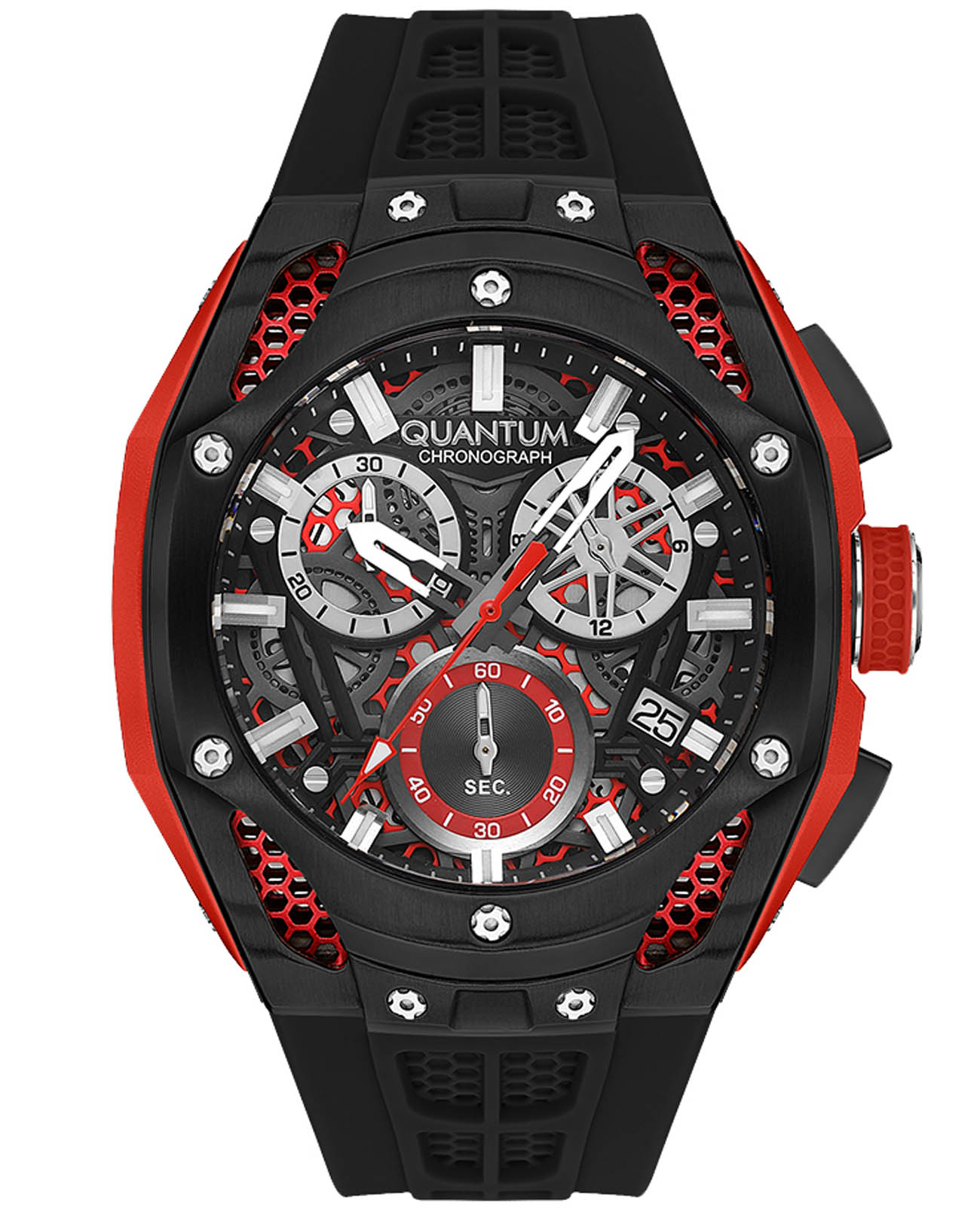 Мужские наручные часы-хронографХронографФункция позволяет измерять отрезки времени с особой точностью: часы, минуты, секунды. Верным признаком хронографа является наличие на циферблате 3 дополнительных окошек-счётчиков. Quantum HNG1102.651, кварцевый механизм с высокой точностью. Минеральное стеклоМинеральное стеклоМинеральное стекло представляет собой искусственно выращенный минерал кварца. Такое стекло отличается особой устойчивостью к повреждениям и царапинам. Уступает по некоторым качествам сапфировому стеклу. устойчивое к появлению царапин, обладающее высокой прозрачностью. Класс водозащиты: 100 метров, позволит плавать, нырять и заниматься другими водными видами спорта. Корпус часов изготовлен из нержавеющей стали с PVD-покрытиемPVDУльтратонкое покрытие наносится в технике вакуумного напыления, сочетает в себе нитрид титана особой прочности со слоем золота или оксида хрома. Несёт в себе декоративную или защитную функцию.. Стрелки и метки с люминесцентным покрытиемЛюминесцентное покрытиеПозволяет считывать показания времени в темноте. Производители наносят на стрелки, часовые индексы, безель или поверхность циферблата светонакопительный состав, дающий холодное свечение.. Каучуковый ремешок.