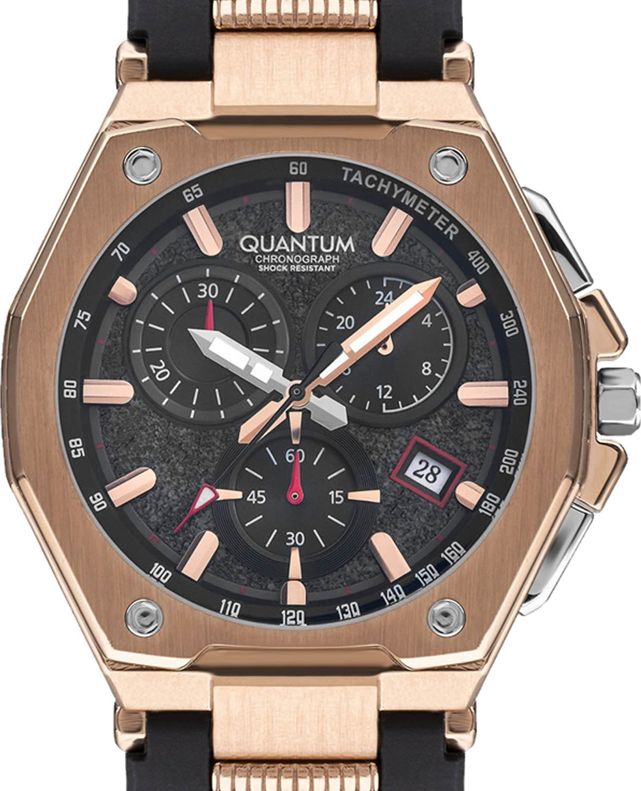 Мужские наручные часы-хронографХронографФункция позволяет измерять отрезки времени с особой точностью: часы, минуты, секунды. Верным признаком хронографа является наличие на циферблате 3 дополнительных окошек-счётчиков. Quantum PWG1005.451, кварцевый механизм с высокой точностью. Минеральное стеклоМинеральное стеклоМинеральное стекло представляет собой искусственно выращенный минерал кварца. Такое стекло отличается особой устойчивостью к повреждениям и царапинам. Уступает по некоторым качествам сапфировому стеклу. устойчивое к появлению царапин, обладающее высокой прозрачностью. Класс водозащиты: 100 метров, позволит плавать, нырять и заниматься другими водными видами спорта. Корпус часов изготовлен из нержавеющей стали с PVD-покрытиемPVDУльтратонкое покрытие наносится в технике вакуумного напыления, сочетает в себе нитрид титана особой прочности со слоем золота или оксида хрома. Несёт в себе декоративную или защитную функцию.. Стрелки и метки с люминесцентным покрытиемЛюминесцентное покрытиеПозволяет считывать показания времени в темноте. Производители наносят на стрелки, часовые индексы, безель или поверхность циферблата светонакопительный состав, дающий холодное свечение.. Браслет из каучука на стандартной застежке.