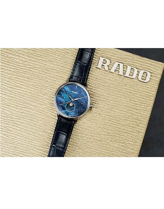Роскошный перламутровый циферблат завораживает переливающейся синевой, напоминая нам о таинственных морских глубинах. Особой красотой обладает календарь, отображающий фазы луны. Такое оформление идеально сочетается с тонким синим ремешком из натуральной кожи. Часы работают за счёт высокоточного кварцевого калибра ETA F05.841. Сапфировое стекло имеет антибликовое покрытие. Апертура даты. Диаметр корпуса: 34 мм.