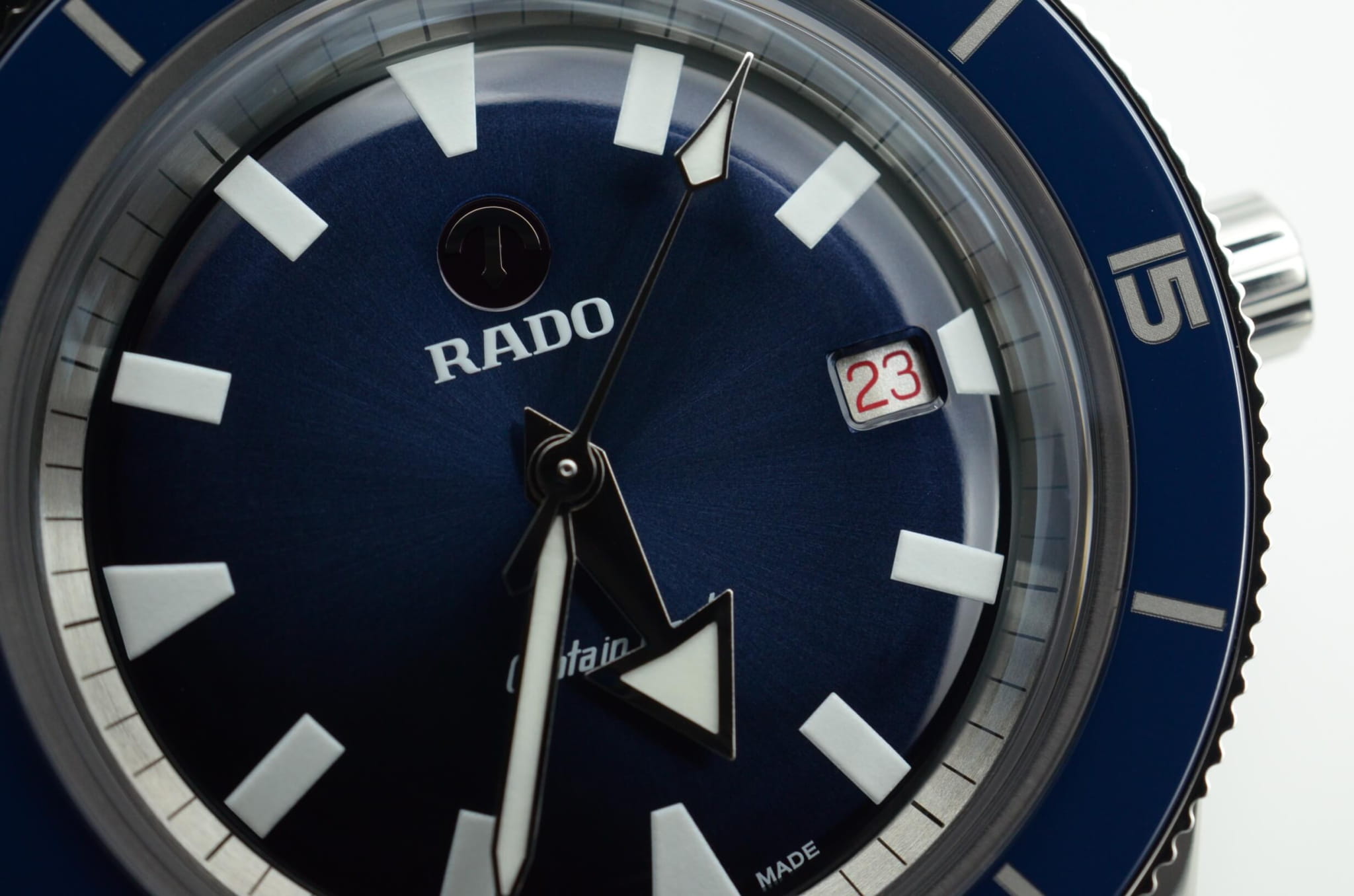 Вращающийся безельБезельВнешний ободок, закрепляющий стекло. В спортивных часах так называется поворотное кольцо с делениями на циферблате, выполняет роль таймера – замеряет отрезки времени на шкале. Неподвижный безель – элемент декора. Однонаправленно вращающийся безель на дайверских часах позволяет фиксировать моменты погружения и выныривания на поверхность. изготовлен из сочетания стали и высокотехнологичной керамикиВысокотехнологичная керамикаИнновационный запатентованный Rado материал с гладкой или матовой поверхностью. Керамика за счёт кристаллической структуры обладает повышенной устойчивостью от возникновения царапин. Материал способен принимать температуру тела человека, обеспечивая невероятный комфорт при ношении., что придаёт ему особую прочность и устойчивость к износу. Керамическая вставка также добавляет часам визуальной выразительности.