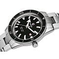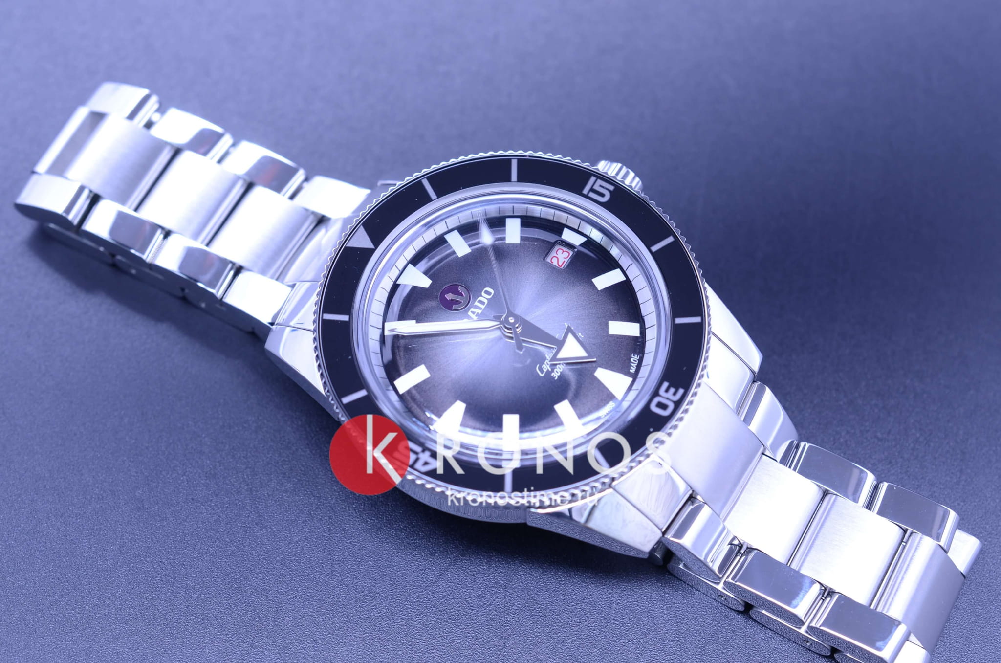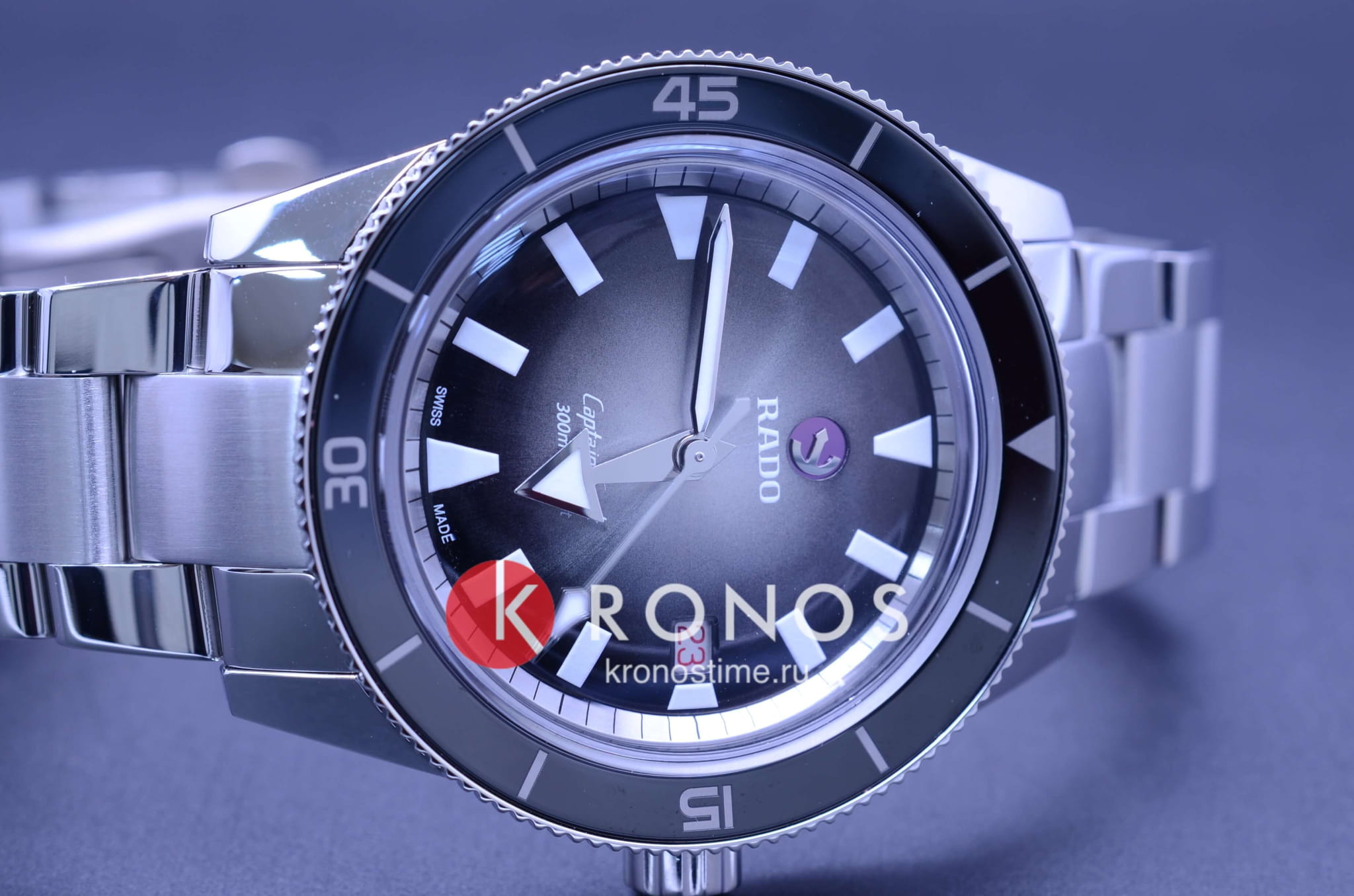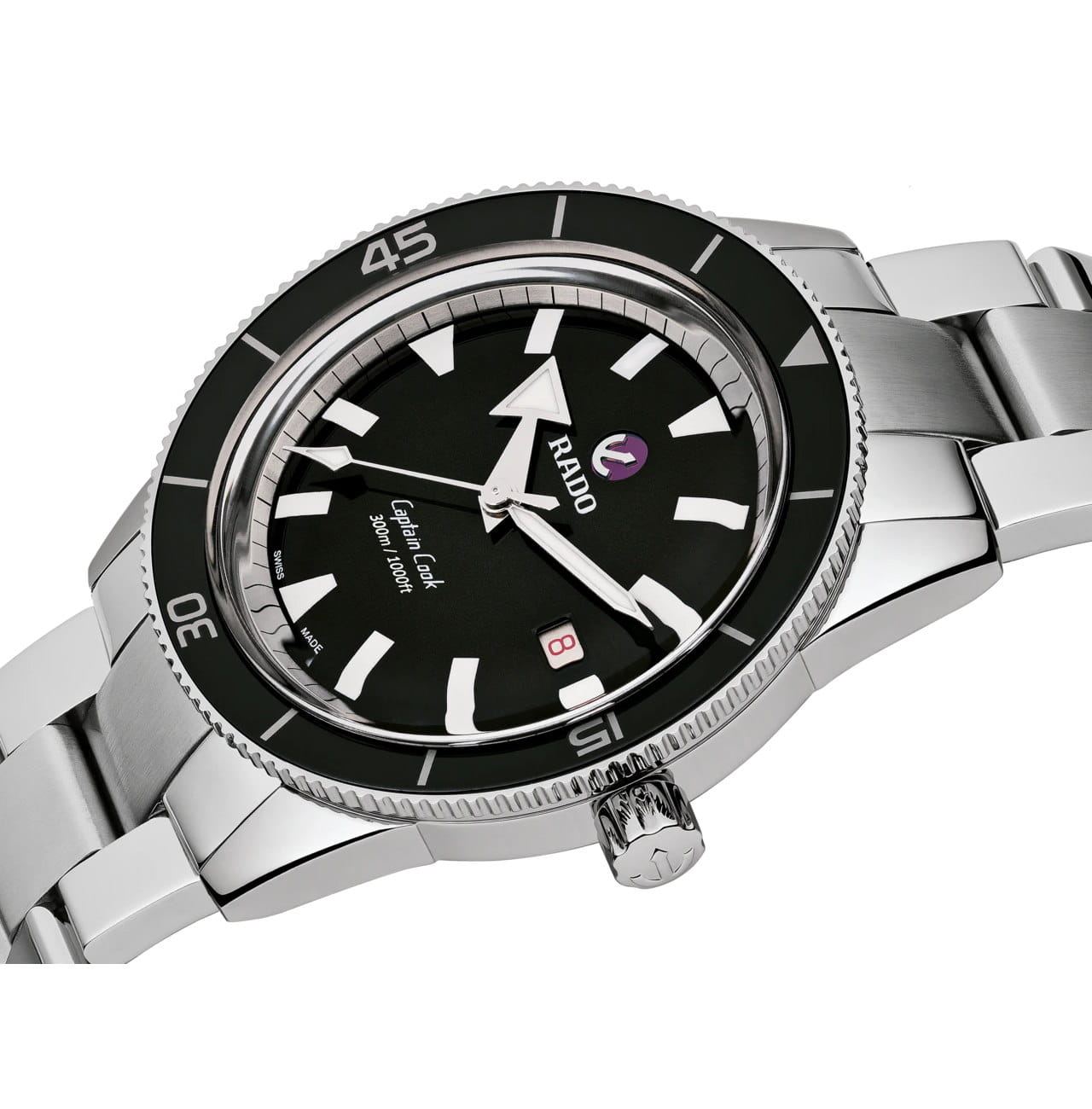 Премиальная модель обладает винтажным характером, чёрный циферблат обращает наше внимание на оригинальные стрелки в виде меча и стрелы. Часы обладают высокими показателями водонепроницаемости - сохранение герметичности до 30 бар, что стало возможным благодаря завинчивающейся задней крышке и заводной головке. Автоподзавод. Швейцарский калибр ETA C07.611 с 80-часовым резервом хода. Антибликовая обработка сапфирового стеклаСапфировое стеклоПрочный и надёжный материал из кристалла сапфира синтетического происхождения, характеризующийся особой твёрдостью и устойчивостью к царапинам и повреждениям.. Корпус из нержавеющей стали 316L, безельБезельВнешний ободок, закрепляющий стекло. В спортивных часах так называется поворотное кольцо с делениями на циферблате, выполняет роль таймера – замеряет отрезки времени на шкале. Неподвижный безель – элемент декора. Однонаправленно вращающийся безель на дайверских часах позволяет фиксировать моменты погружения и выныривания на поверхность. из высокотехнологичной керамикиВысокотехнологичная керамикаИнновационный запатентованный Rado материал с гладкой или матовой поверхностью. Керамика за счёт кристаллической структуры обладает повышенной устойчивостью от возникновения царапин. Материал способен принимать температуру тела человека, обеспечивая невероятный комфорт при ношении.. Прочный стальной браслет. Отображение числа. Диаметр корпуса: 42 мм.