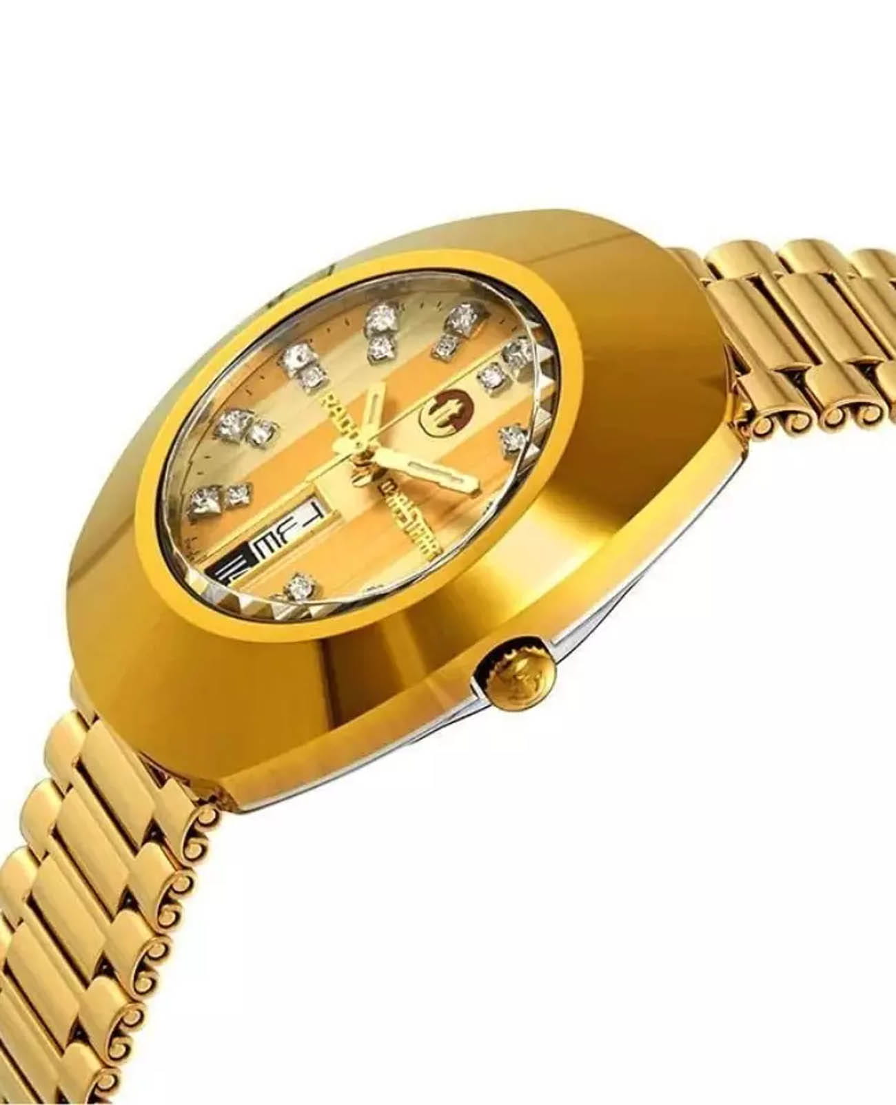 Женские часы Rado The Original Automatic R12416803 с надёжным автоматическим механизмом. Корпус и браслет часов выполнены из нержавеющей стали c PVD-покрытиемPVDУльтратонкое покрытие наносится в технике вакуумного напыления, сочетает в себе нитрид титана особой прочности со слоем золота или оксида хрома. Несёт в себе декоративную или защитную функцию.. Стальной браслет на раскладной застёжкеРаскладная застёжкаТакой тип застёжки используется только на браслетах из металла. Она никогда не раскрывается полностью, происходит разделение на 2 и более частей. Раскладывающая застёжка снизит вероятность потери часов к минимуму.. Класс водозащиты: 30 метров, позволит защитить корпус от случайных брызг или капель дождя. Окошко даты находится в положении 6 часов. Циферблат инкрустирован сапфирами. Стрелки и метки с люминесцентным покрытиемЛюминесцентное покрытиеПозволяет считывать показания времени в темноте. Производители наносят на стрелки, часовые индексы, безель или поверхность циферблата светонакопительный состав, дающий холодное свечение..