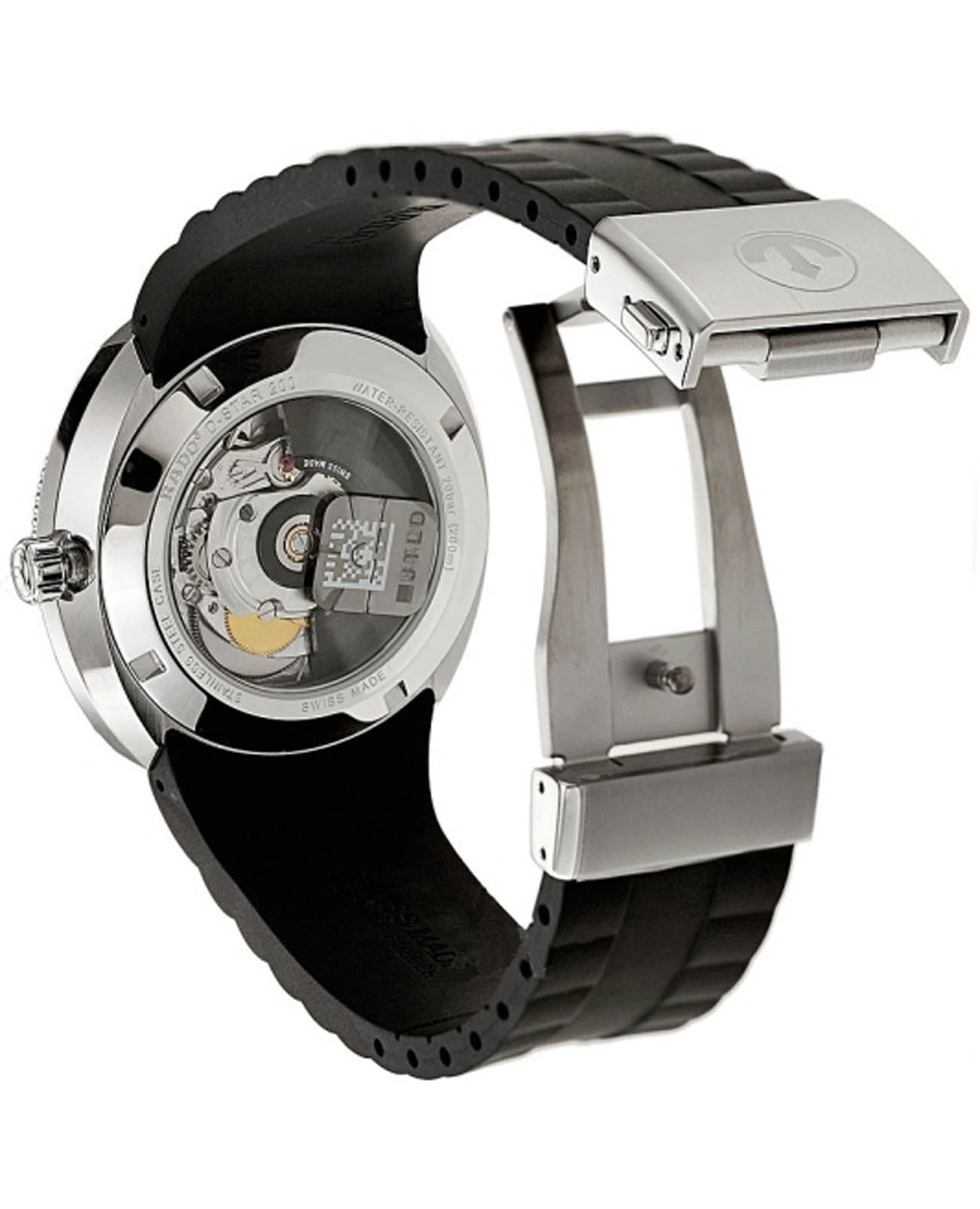 Мужские механические швейцарские часы с автоподзаводом Rado D-Star R15959159. Сапфировое стеклоСапфировое стеклоПрочный и надёжный материал из кристалла сапфира синтетического происхождения, характеризующийся особой твёрдостью и устойчивостью к царапинам и повреждениям. устойчивое к мелким механическим повреждениям. Корпус часов изготовлен из нержавеющей стали. БезельБезельВнешний ободок, закрепляющий стекло. В спортивных часах так называется поворотное кольцо с делениями на циферблате, выполняет роль таймера – замеряет отрезки времени на шкале. Неподвижный безель – элемент декора. Однонаправленно вращающийся безель на дайверских часах позволяет фиксировать моменты погружения и выныривания на поверхность. из высокотехнологичной керамикиВысокотехнологичная керамикаИнновационный запатентованный Rado материал с гладкой или матовой поверхностью. Керамика за счёт кристаллической структуры обладает повышенной устойчивостью от возникновения царапин. Материал способен принимать температуру тела человека, обеспечивая невероятный комфорт при ношении.. Окошко даты находится в положении 3 часа. Стрелки с люминесцентным покрытиемЛюминесцентное покрытиеПозволяет считывать показания времени в темноте. Производители наносят на стрелки, часовые индексы, безель или поверхность циферблата светонакопительный состав, дающий холодное свечение.. Класс водозащиты: 200 метров, позволит плавать, нырять и заниматься другими водными видами спорта. Каучковый ремешок на раскладной застёжкеРаскладная застёжкаТакой тип застёжки используется только на браслетах из металла. Она никогда не раскрывается полностью, происходит разделение на 2 и более частей. Раскладывающая застёжка снизит вероятность потери часов к минимуму..