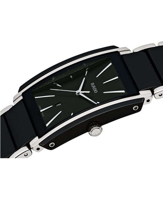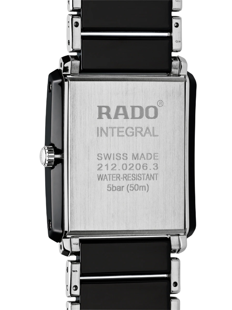 Часы Rado Integral (артикул R20206162) представляют собой элегантное сочетание высокотехнологичной керамикиВысокотехнологичная керамикаИнновационный запатентованный Rado материал с гладкой или матовой поверхностью. Керамика за счёт кристаллической структуры обладает повышенной устойчивостью от возникновения царапин. Материал способен принимать температуру тела человека, обеспечивая невероятный комфорт при ношении. и нержавеющей стали, отражая фирменный стиль бренда Rado. Корпус размером 31,0 x 41,1 мм выполнен из комбинированных материалов с водозащитой до 5 бар (50 метров). Циферблат чёрного цвета оснащён серебристыми стрелками и часовыми метками, а также окошком даты в положении «6 часов». Циферблат защищён сапфировым стекломСапфировое стеклоПрочный и надёжный материал из кристалла сапфира синтетического происхождения, характеризующийся особой твёрдостью и устойчивостью к царапинам и повреждениям., устойчивым к царапинам.